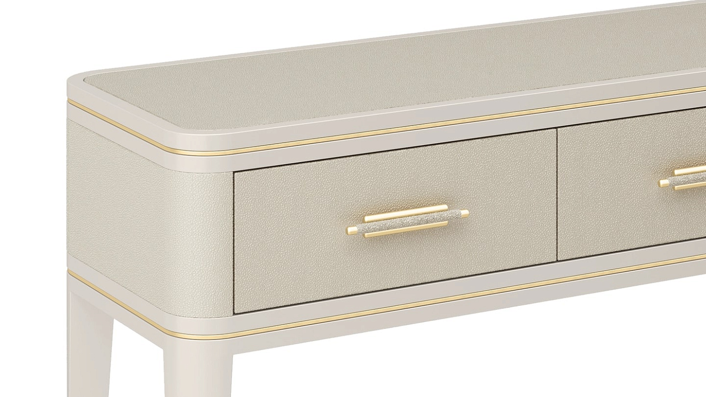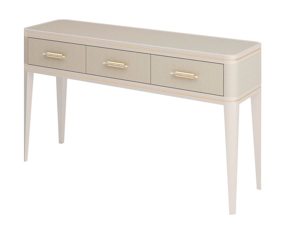 Консоль CLICQUOT с элегантными пропорциями, выполненная в классическом стиле, включает в себя три выдвижных ящика и длинные заостренные ножки. Изысканное сочетание кожи, лакированного дерева и матовой латуни демонстрирует чистую элегантность нейтральных оттенков.