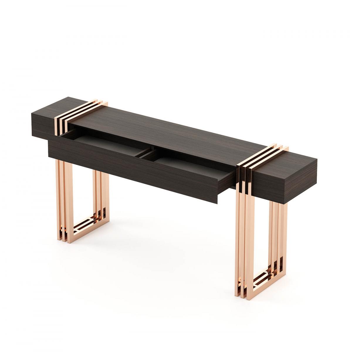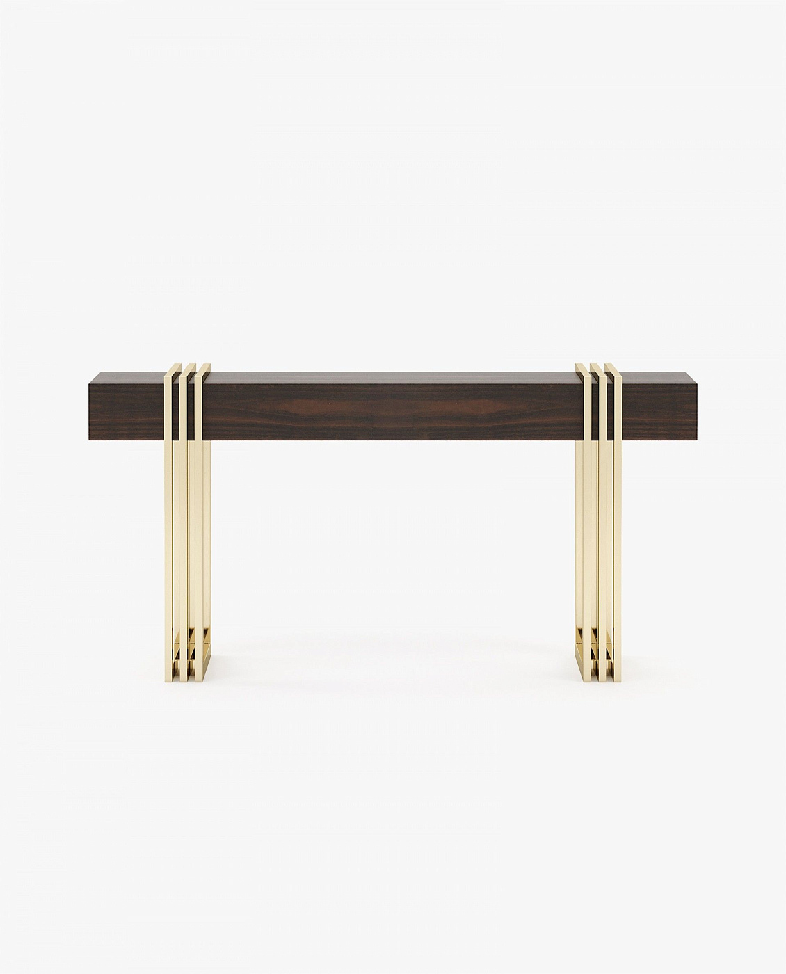 Evelyn-это современная консоль середины века, которая играет с материалами, чтобы создать уникальный дизайн. Деревянная верхняя часть включает в себя 2 ящика, а ее конструкция представляет собой металлический каркас.