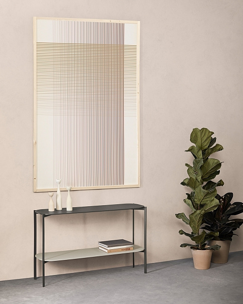 Коллекция состоит из журнальных и кофейных столиков, консолей и подставок для телевизора, главной особенностью которых является их внешняя структура, выполненная из окрашенного металла и шпонированного или окрашенного MDF.