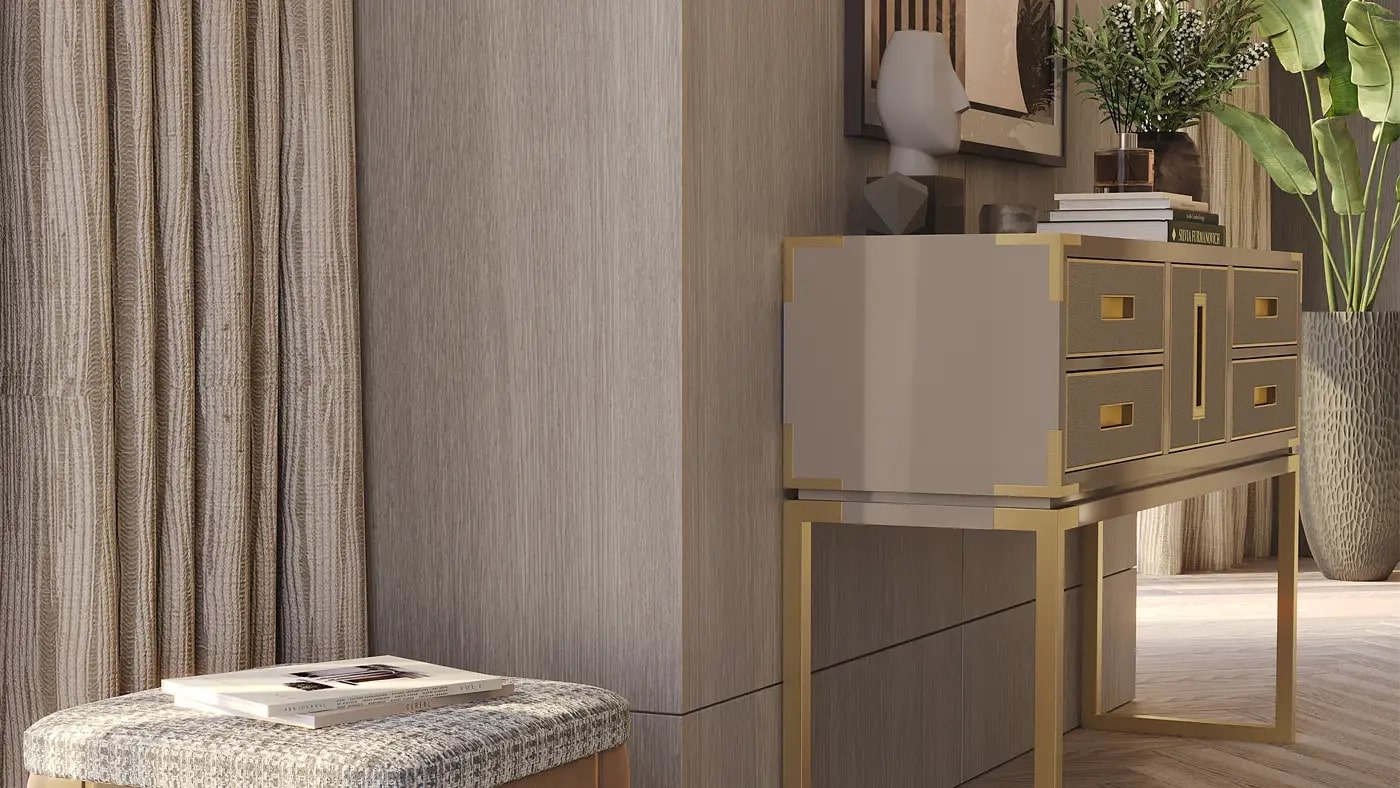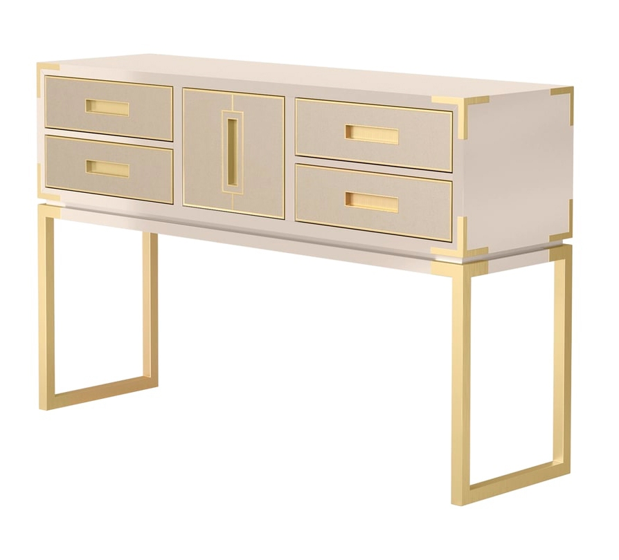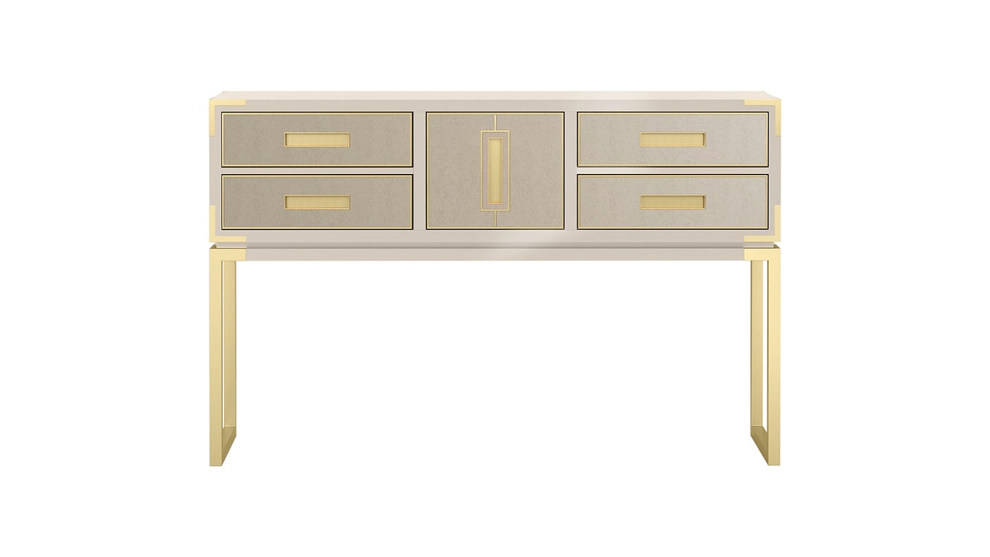 Прямоугольный ящик для хранения GARDNER console, созданный для того, чтобы вызывать восхищение, напоминает старинный багажник кареты. Он оснащен пятью выдвижными ящиками с кожаными фасадами и врезными ручками, изготовлен из глянцевого лакированного дерева и установлен на основании из матовой латуни.