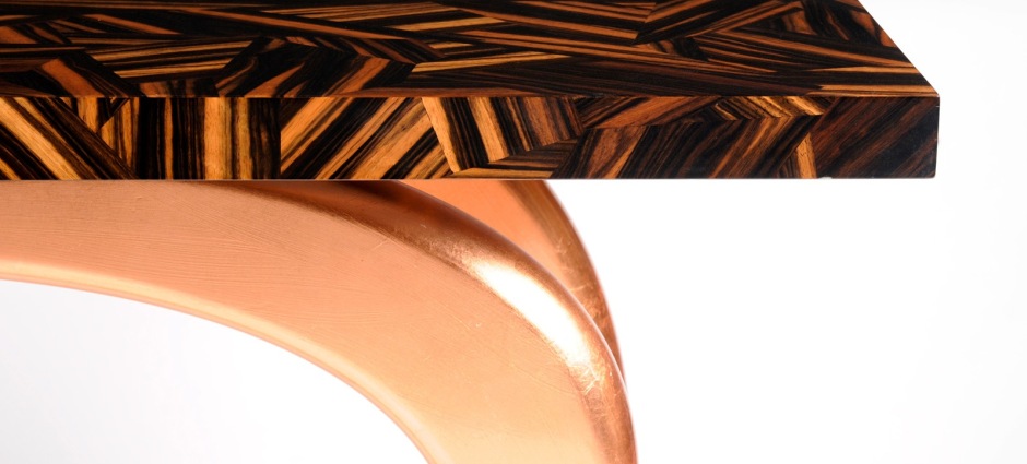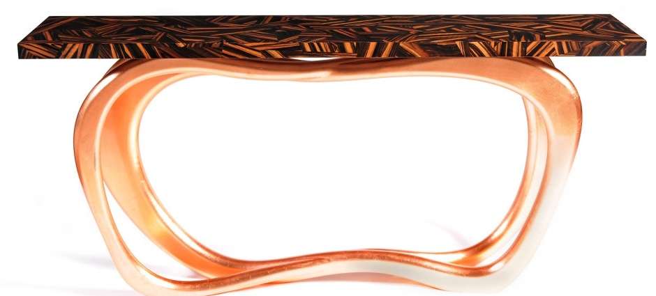 Консоль Infinity, как и любая мебель от компании Boca do Lobo, источает стиль, изысканность и роскошь. Это по-настоящему впечатляющий и привлекательный предмет мебели, который поражает своими формами. Консоль Infinity, подобно консоли Sinuous, обладает мерцающей аурой, которая наполняет помещение благородным стилем. Эта консоль будет прекрасно смотреться в интерьере современной прихожей или спальни. Корпус и основание консоли изготовлено из массива дерева. При этом верхняя часть консоли украшена замысловатой мозаикой из шпона черного дерева. Основание покрыто медью и глянцевым лаком.