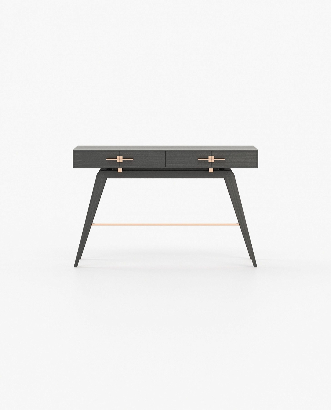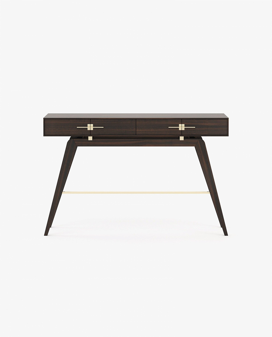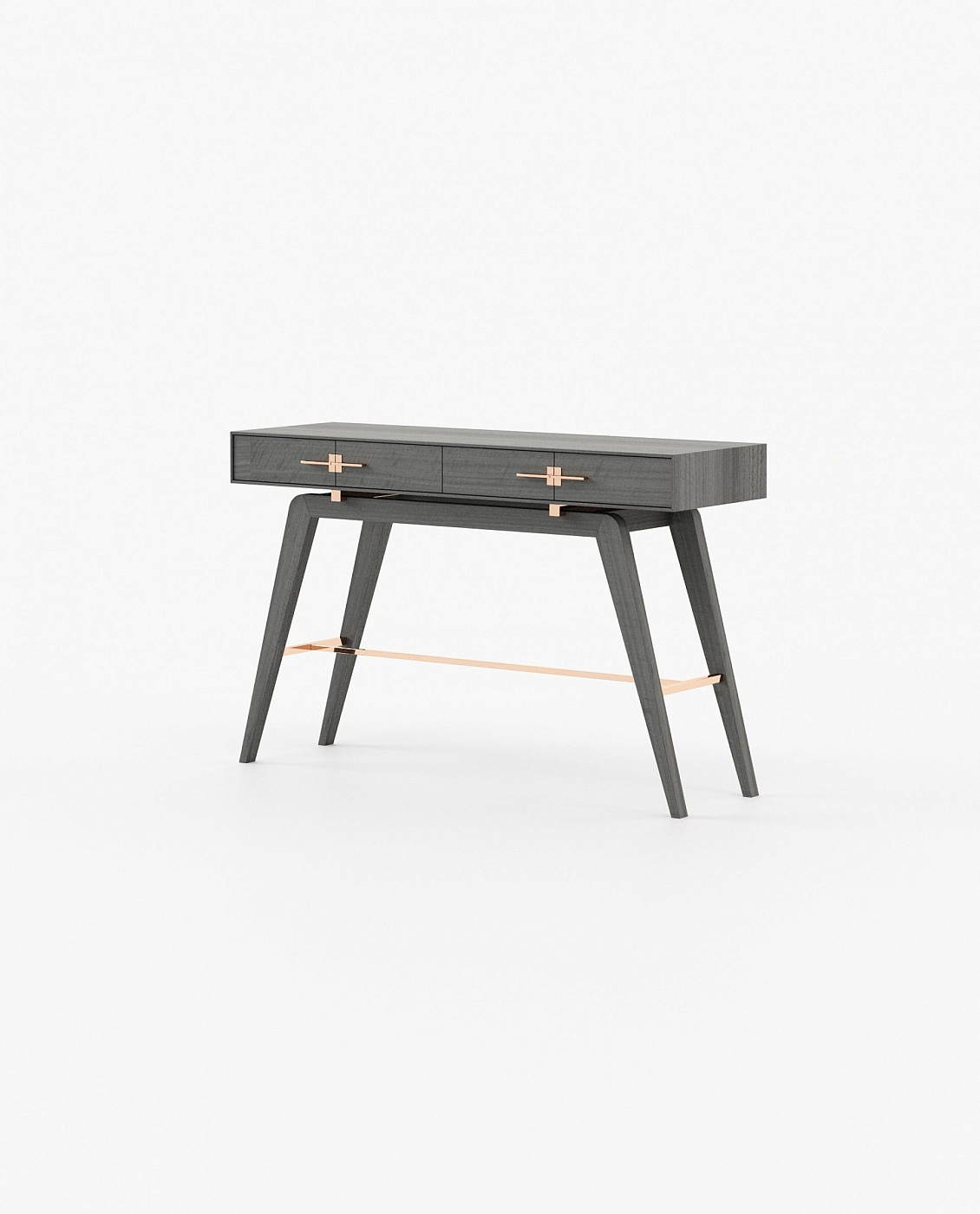 Niels - это современный консольный столик, отделанный деревянным шпоном и эффектной отделкой из нержавеющей стали. Он идеально подходит для оформления открытых пространств, а его угловые ножки создают уникальную винтажную эстетику, а два выдвижных ящика обеспечивают достаточно места для хранения.
