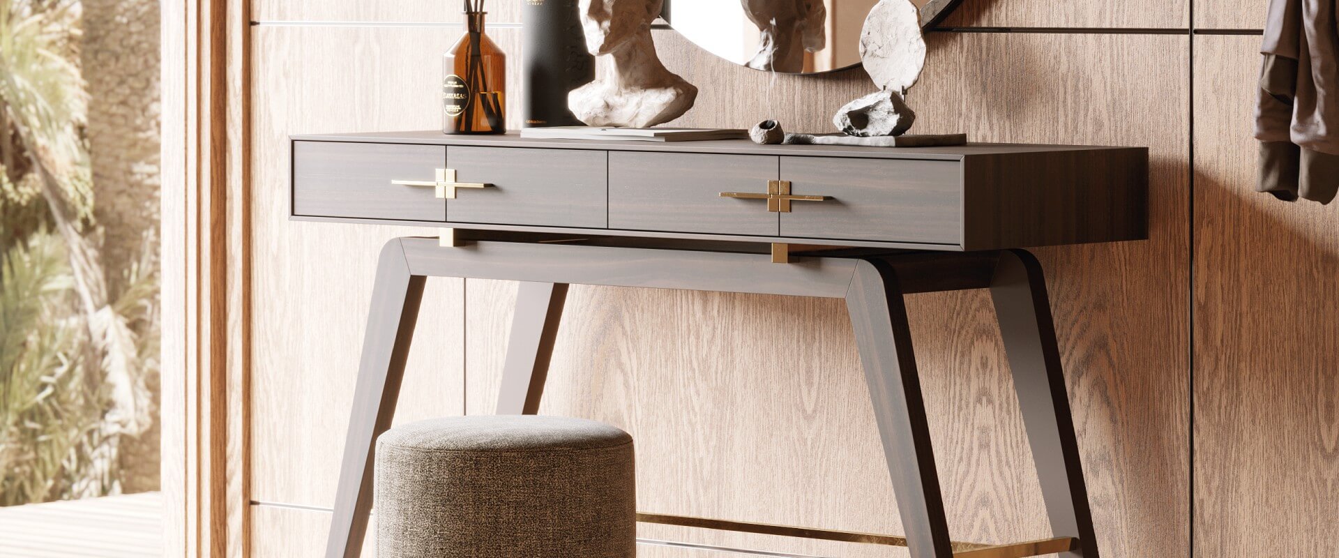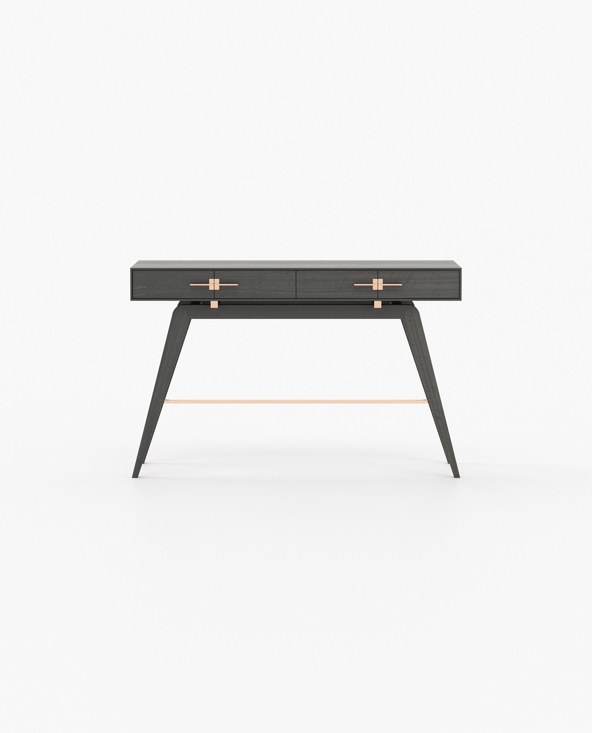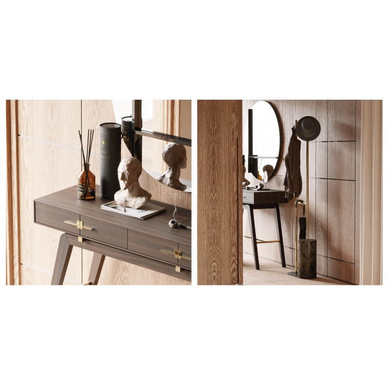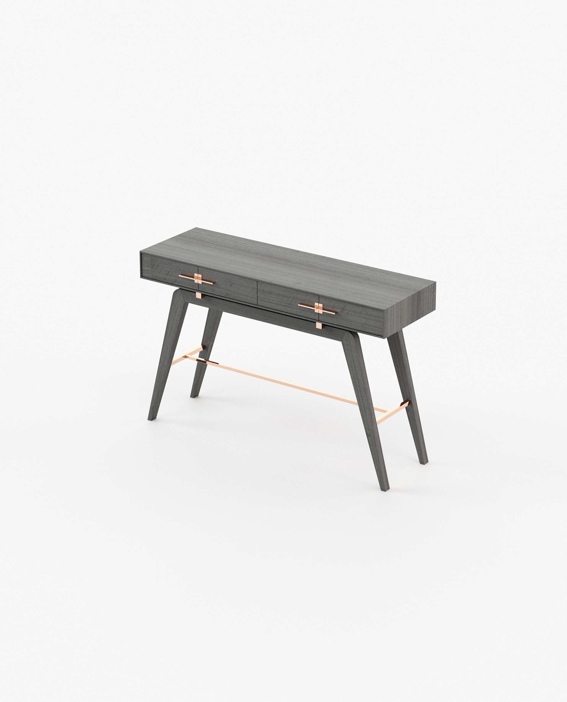 Niels - это современный консольный столик, отделанный деревянным шпоном и эффектной отделкой из нержавеющей стали. Он идеально подходит для оформления открытых пространств, а его угловые ножки создают уникальную винтажную эстетику, а два выдвижных ящика обеспечивают достаточно места для хранения.