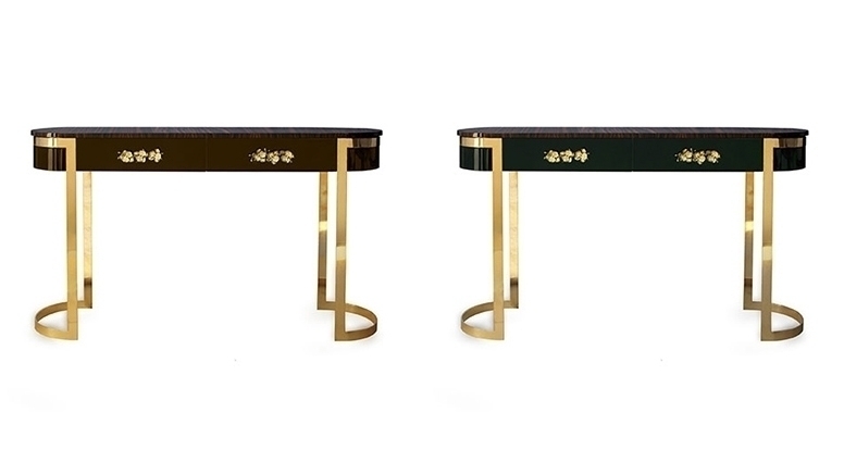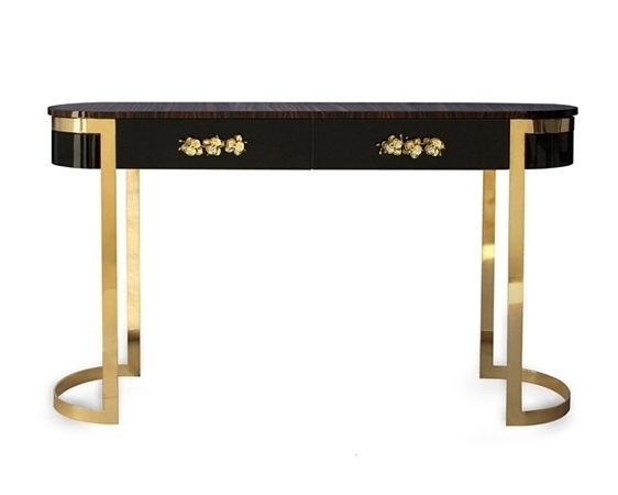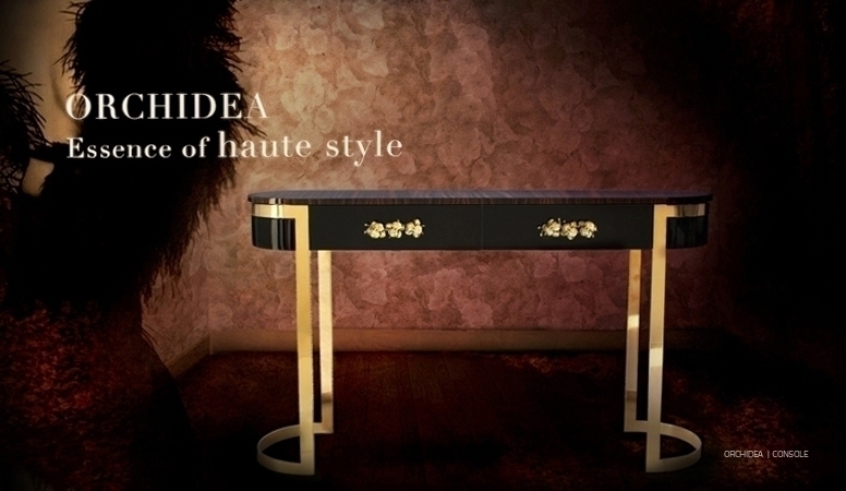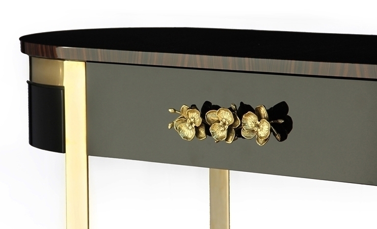 В винтажной выразительности этой элегантной консоли воплощена вся сущность высокого стиля. Нельзя устоять перед чувственными изгибами и лёгкой позолотой консоли Orchidea. Верхняя часть овальной формы с двумя ящиками, обитыми изнутри чёрным бархатом и украшенными литыми бронзовыми ручками в виде орхидей, лежит на металлической основе. Консоль выполнена из шпона, покрытого черным глянцевым лаком. По желанию клиента цвет отделки можно изменить.