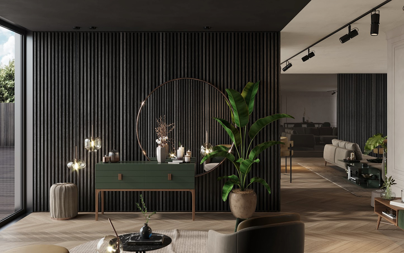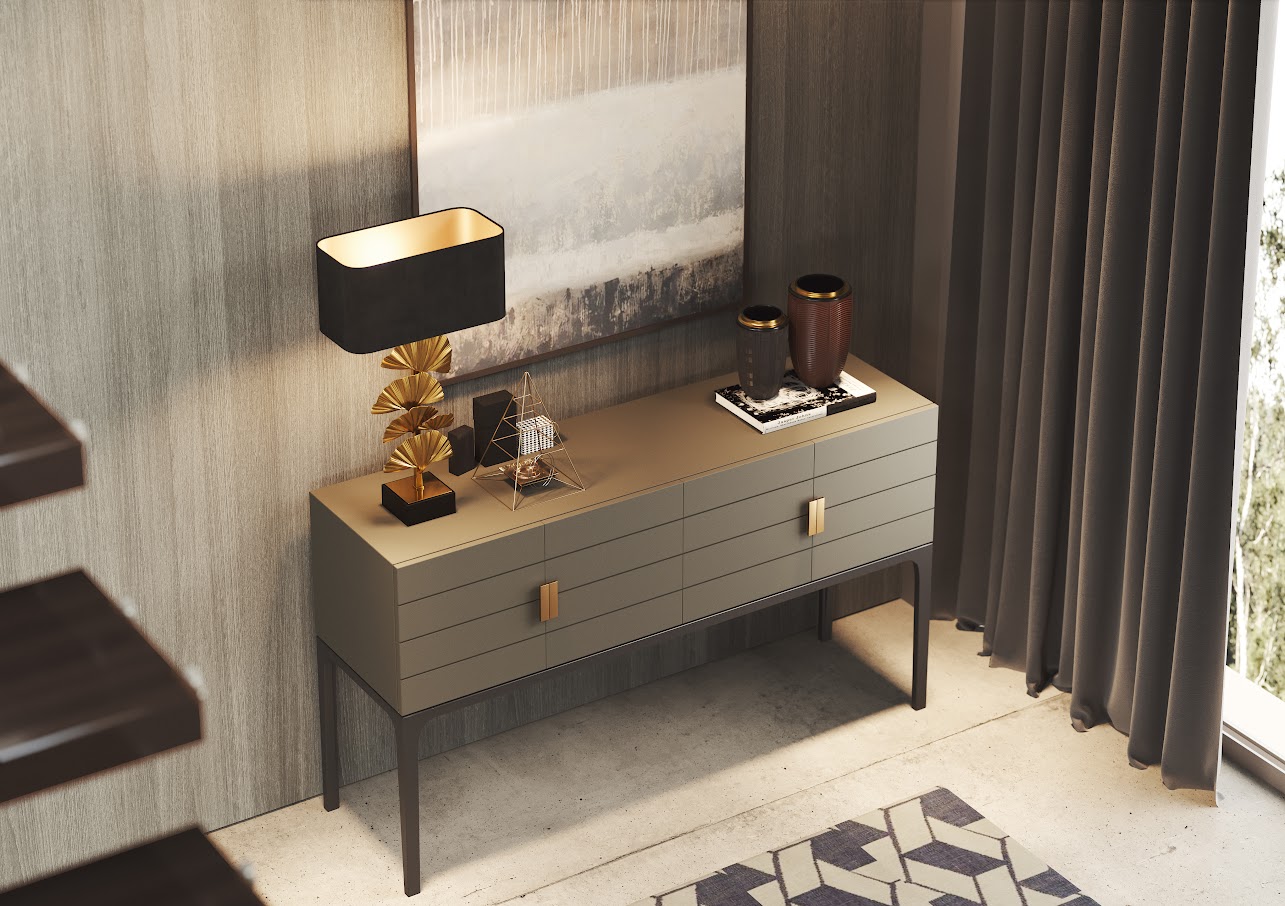 Pavanne — консоль современных линий, отличающаяся симметричным резным узором на дверцах, который придает более горизонтальный вид, тем самым убирая часть визуального веса. Универсальное решение, которое подойдет для любой столовой.