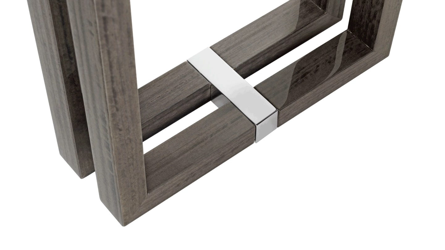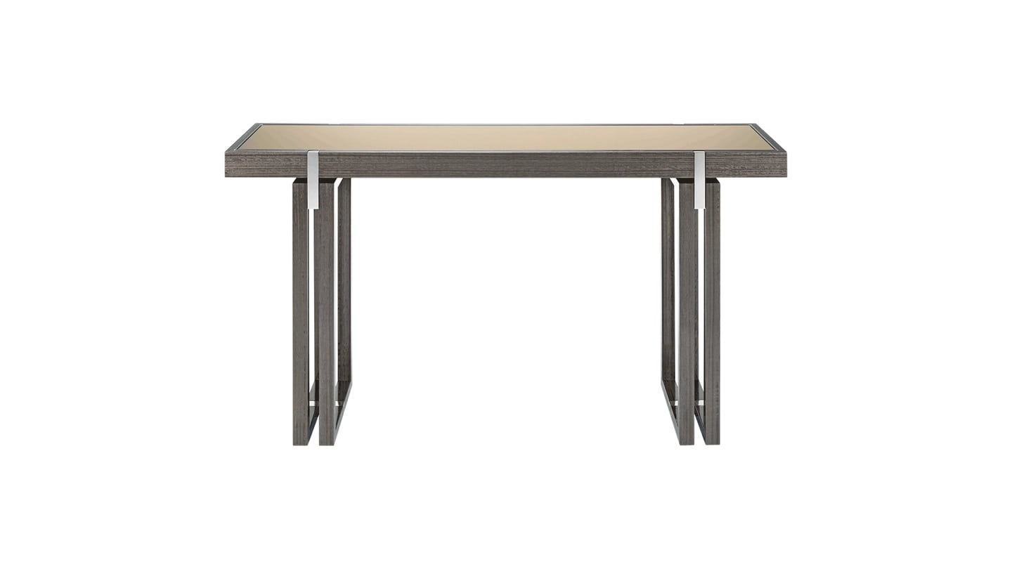 Изящная консоль SEOUL, воплощающая геометрию прямоугольников, имеет складывающиеся ножки, изготовленные из деревянного шпона, соединения из нержавеющей стали и поверхность, инкрустированную бронзовым зеркалом, которое привлекает внимание, отражая любые предметы, размещенные сверху.