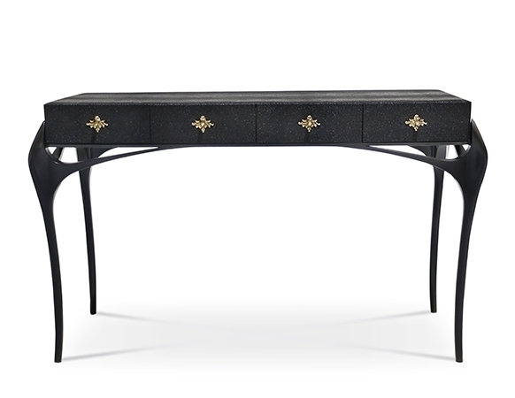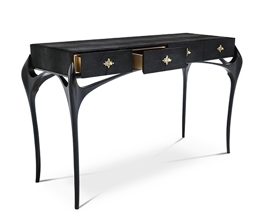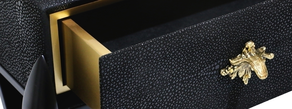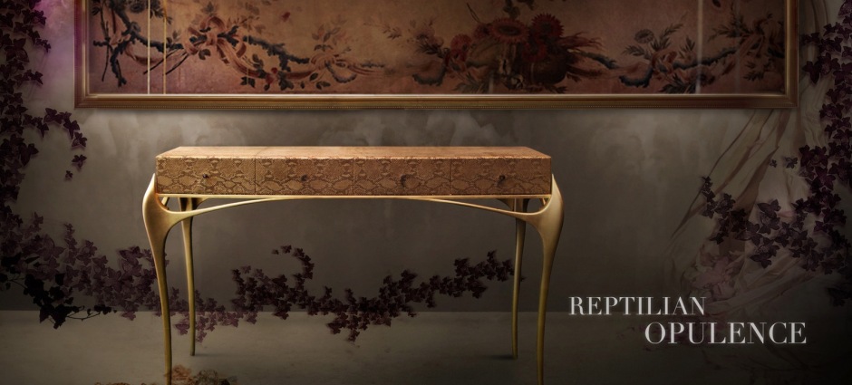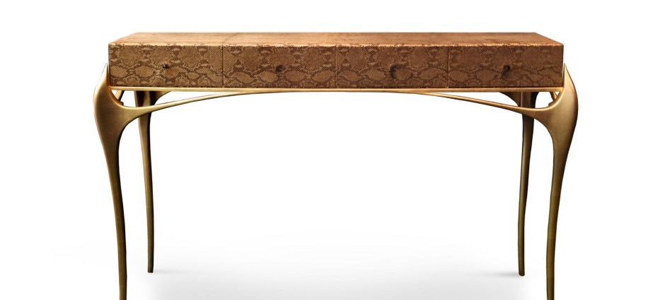 Консоль Temptation станет украшением Вашего дома. Четыре верхних ящика богато "завернуты" в бронзовое тиснение, отделка ящиков выполнена из кожи питона. Каждый ящик украшен кристаллами.