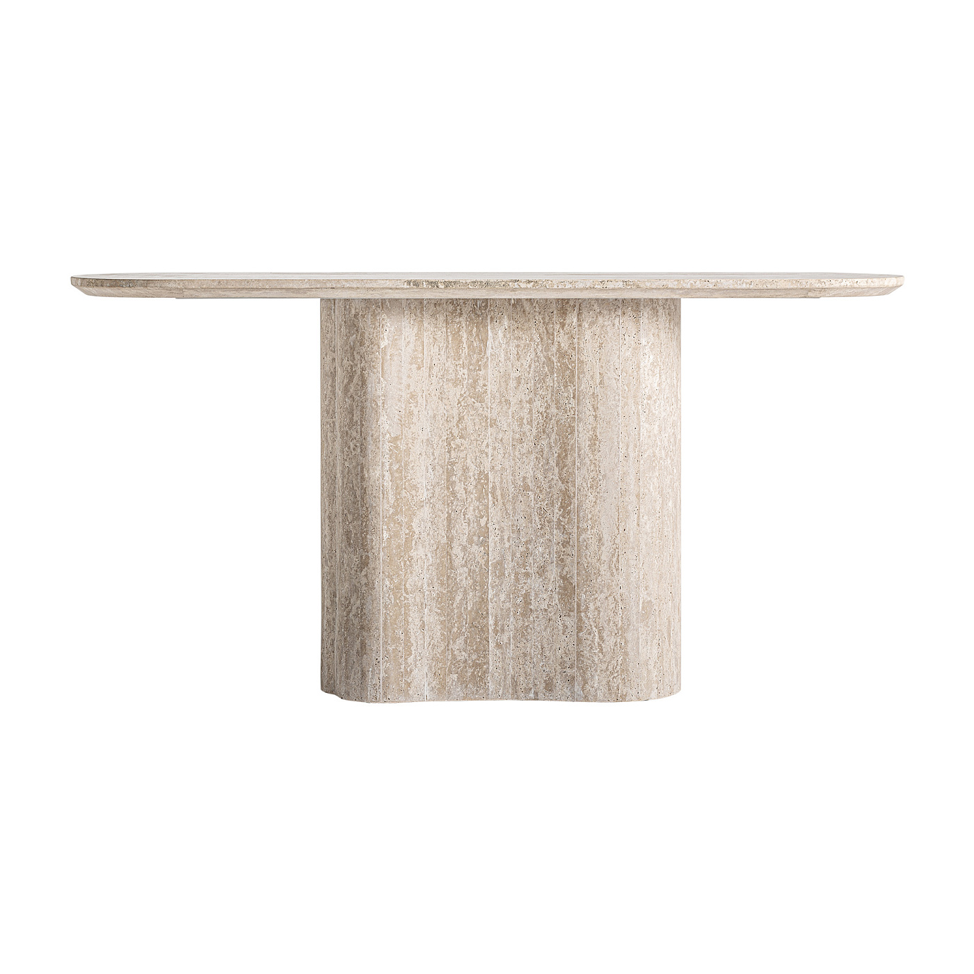 Консольный столик Thiennes в стиле ар-деко, изготовлен из бежевого травертина. Изделие продаётся в разобранном виде. Консоль изготовлен(а) из натуральных материалов, поэтому каждый из них будет эксклюзивным, со своими уникальными оттенками и текстурами. Пористость и неоднородность материала не считаются браком Ширина: 160 см, Глубина: 45 см, Высота: 80 см