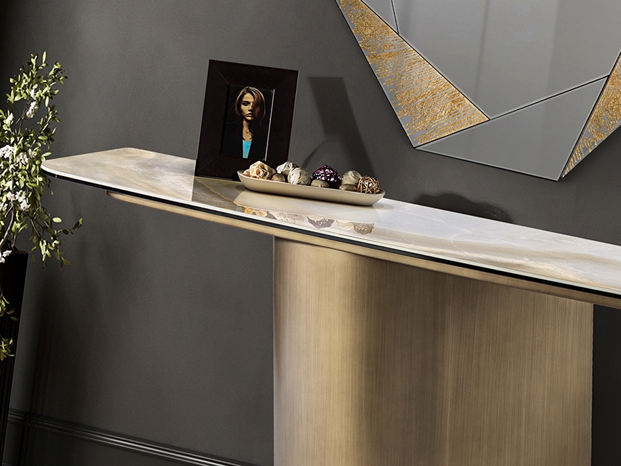 Консольный столик из металла с отделкой из матовой латуни. Столешница из ламинированного фарфора и стекла с декором из прожилок мрамора.