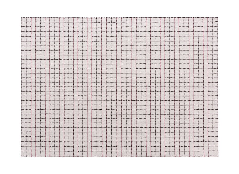 Это чёрно-розовый ковёр из нашей коллекции Reti, разработанный студией Terhedebrügge, который сочетает в себе высокоструктурированный, современный узор в виде сетки с традиционной техникой ручного ткачества. Он подходит для использования на открытом воздухе, так как изготовлен из переработанных ПЭТ-волокон чёрного и розового оттенков на белой основе.