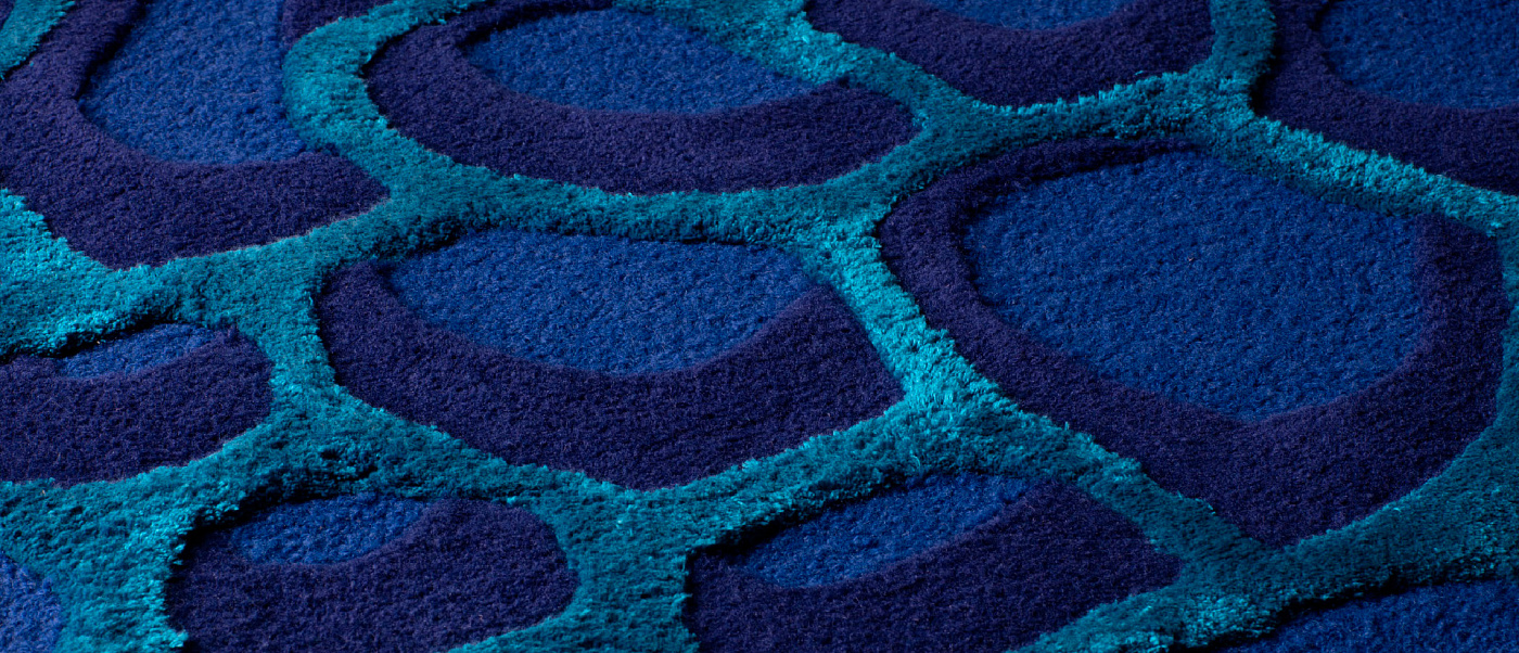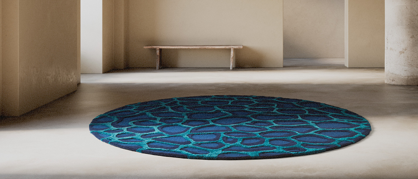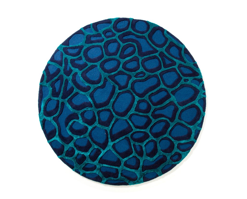 Этот круглый ковер Textures #Abyss с органическими формами, кажущимися простыми, скрывает текстуры и высоты, предлагая трехмерный вид и тщательную отделку, приятную на ощупь.