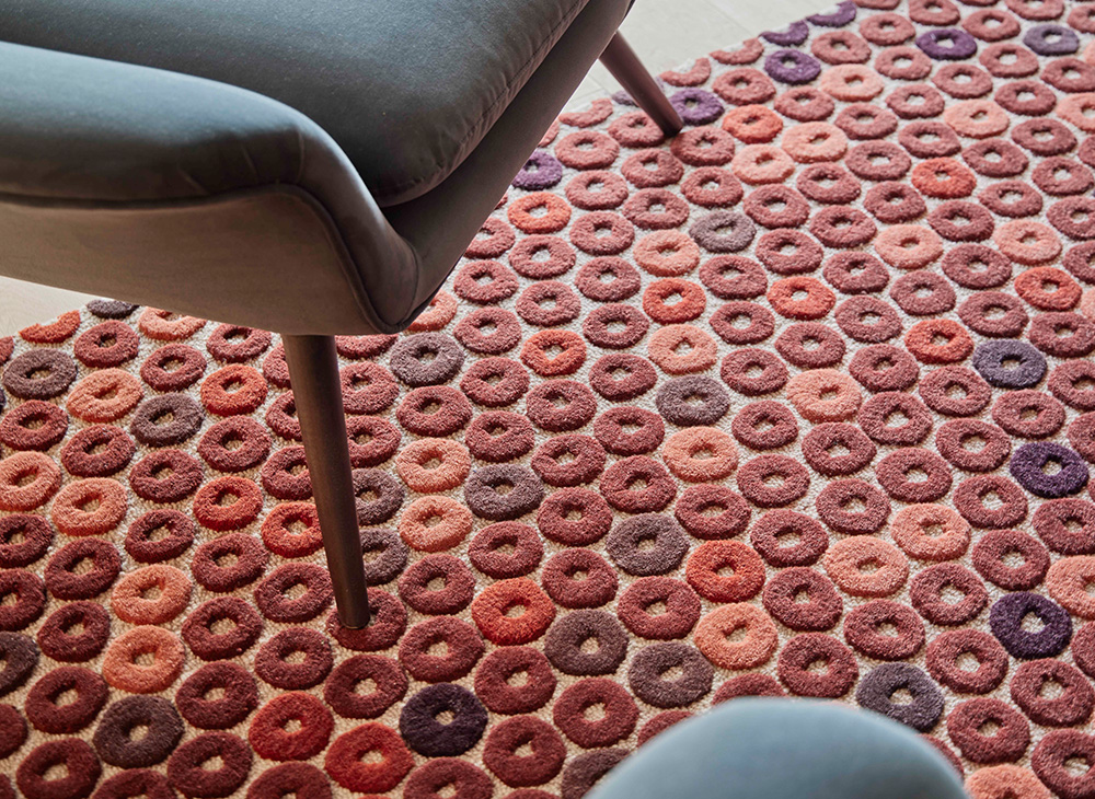 Конфеты с дырочкой: CHIMOS получил свое название от конфет, которые были очень популярны в восьмидесятые, также известных в Америке как Life Savers. В ЧИМОСЕ главным действующим лицом является единственная фигура, диск, повторяющийся в хроматическом склонении своего основного цвета на контрастном фоне. Графическая линия, определяющая каждый диск, приобретает силу благодаря изменениям объема, возникающим в результате кропотливой работы по тафтингу из натуральной шерсти