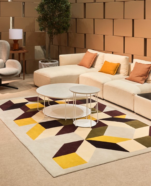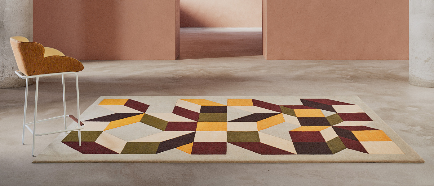 Современный и эффектный ковер с трёхмерным геометрическим узором, создающим оптическую иллюзию глубины. Вдохновленный оп-артом и геометрическим искусством, этот ковер идеально подходит для минималистичных, современных и даже креативных интерьеров. Его цветовая палитра сочетает тёплые тона (жёлтый и бордовый) с землистыми (зелёный и бежевый), что позволяет адаптировать его как к тёплым, так и к прохладным помещениям.
