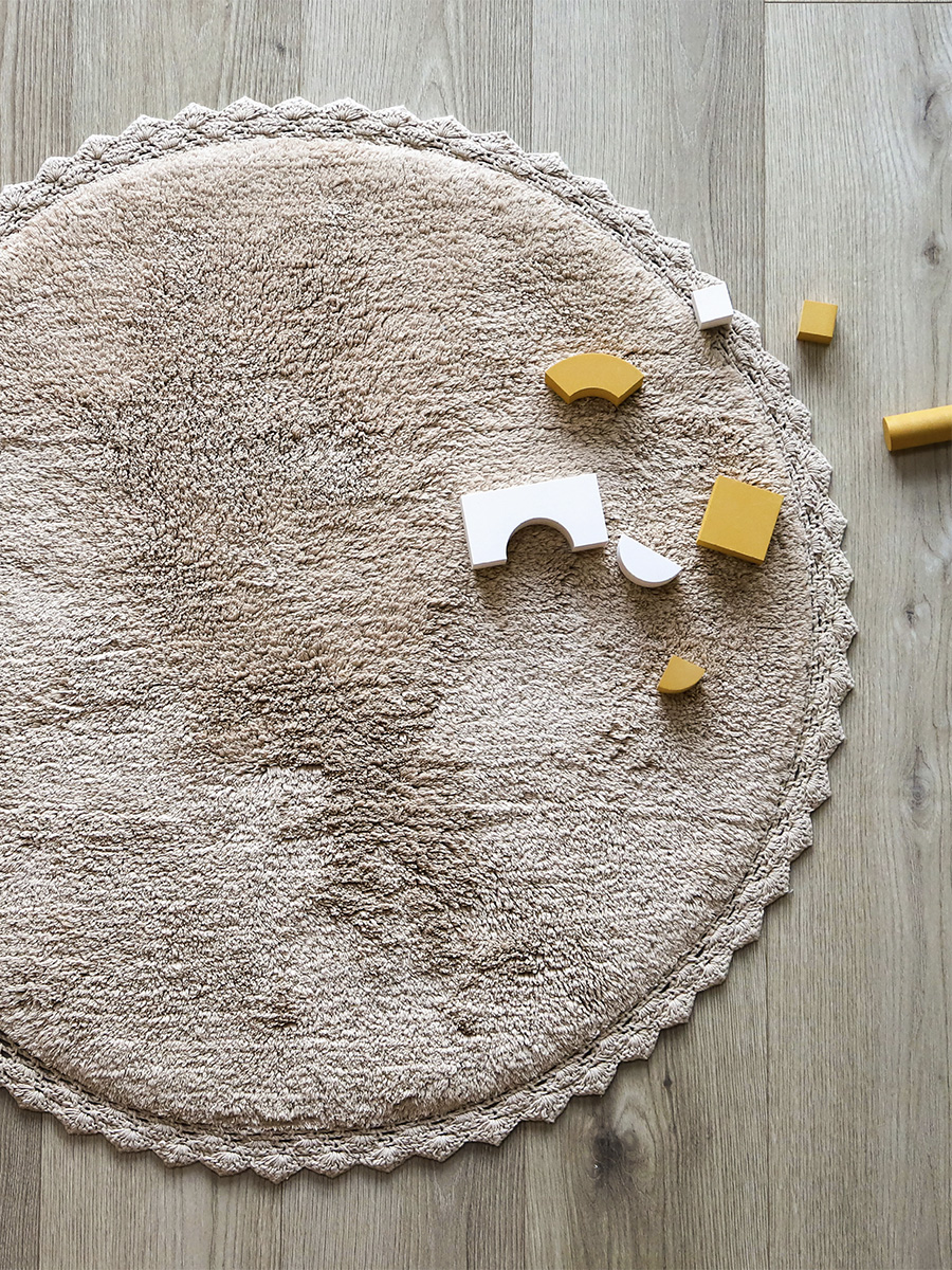 Этот красивый круглый и сдержанный ковер из натурального материала изготовлен вручную из 100% хлопка и сертифицирован OEKO-TEX.