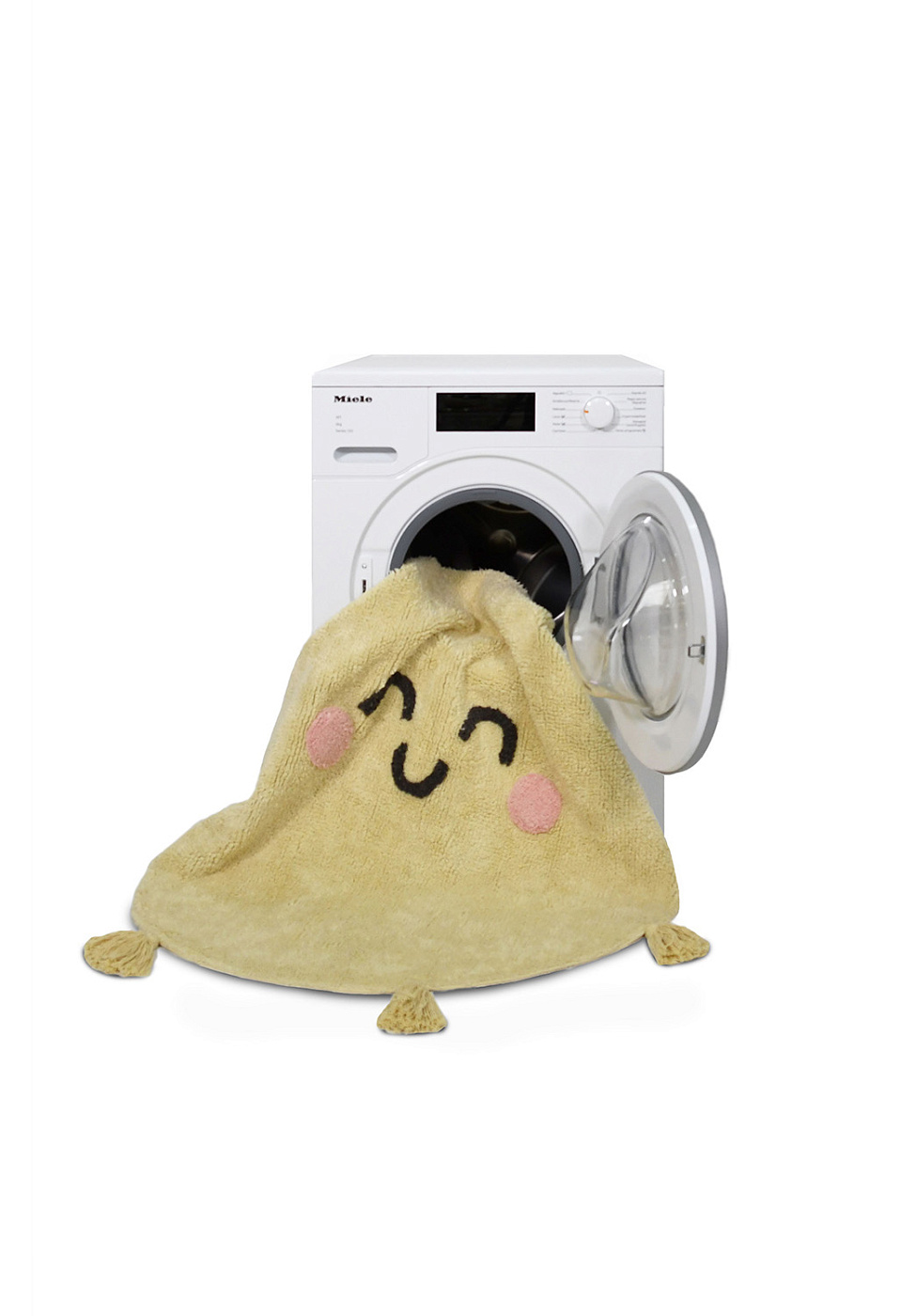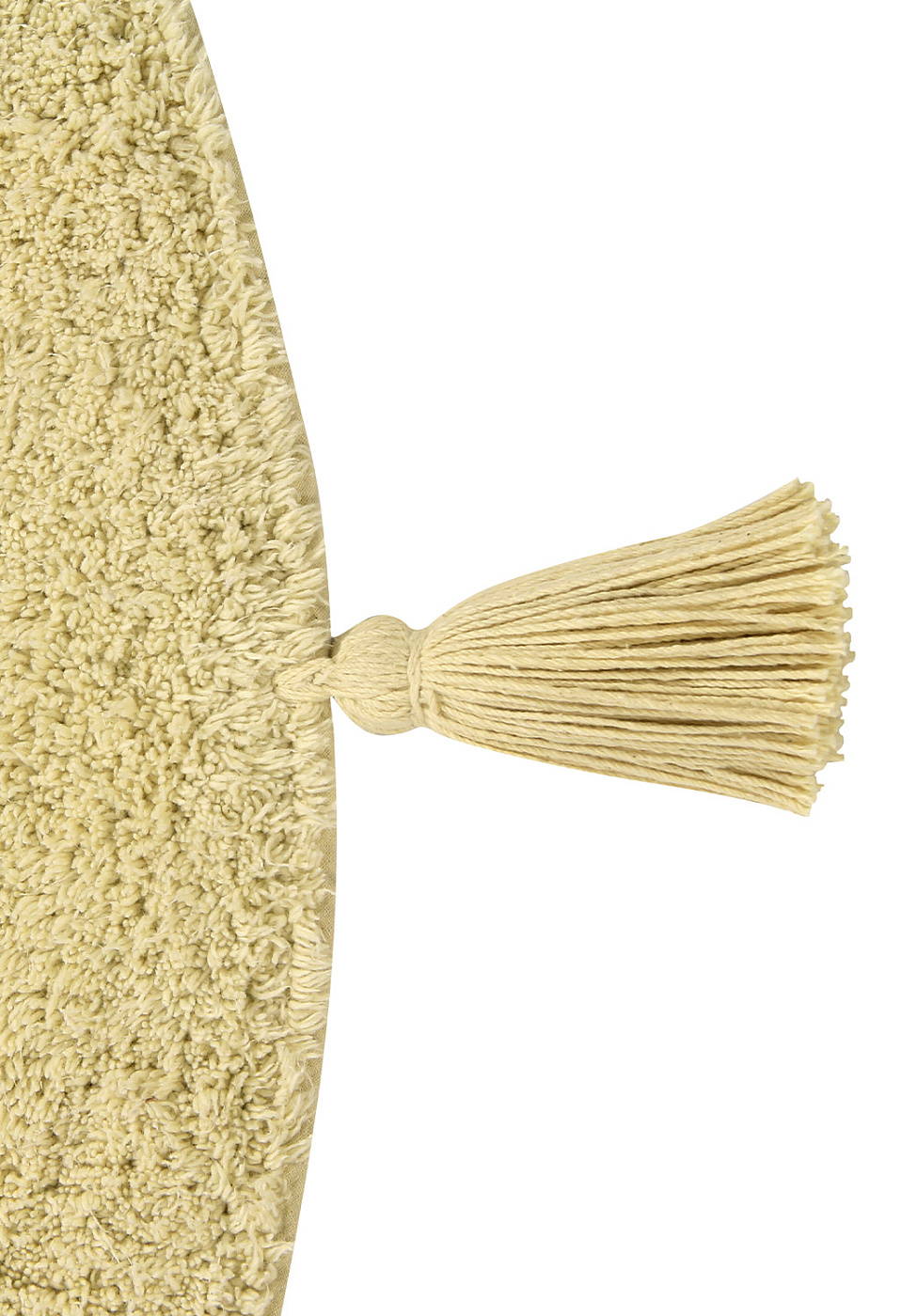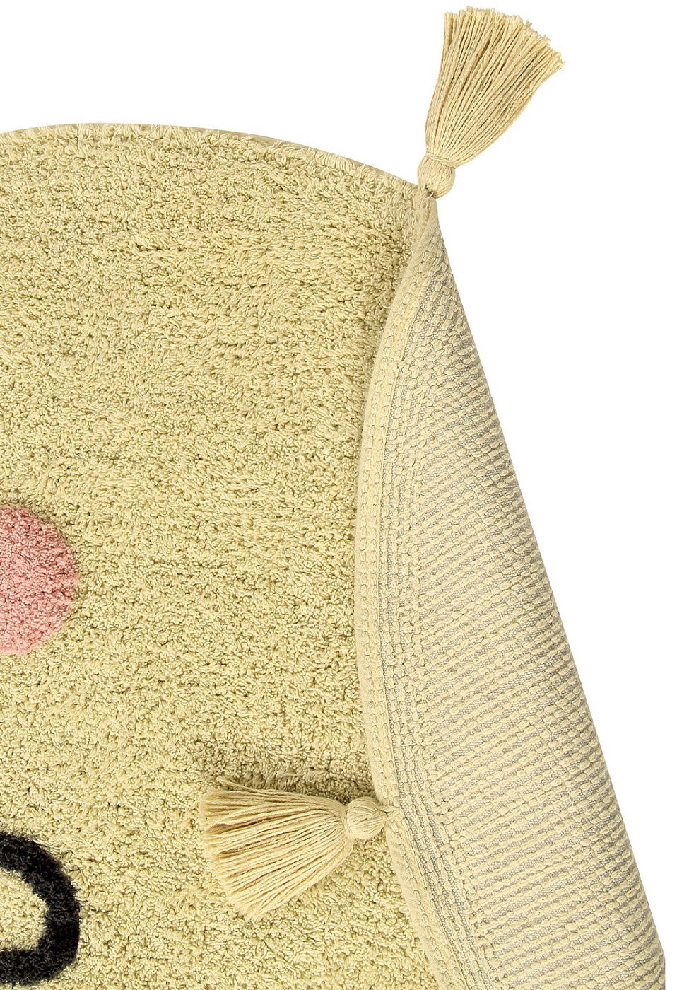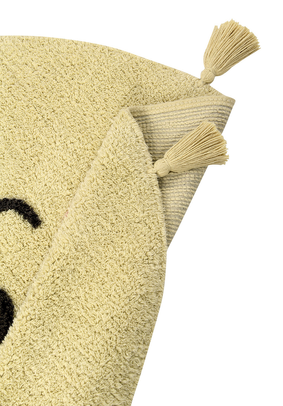 Круглый ковер ярко-желтого цвета выполнен из натурального хлопка и окрашен безопасными красителями. Объемные детали и кисточки по краям ковра добавляют ему оригинальности. Такой ковер прекрасно подойдет для детской комнаты как мальчика, так и девочки и будет поднимать настроение всей семье.