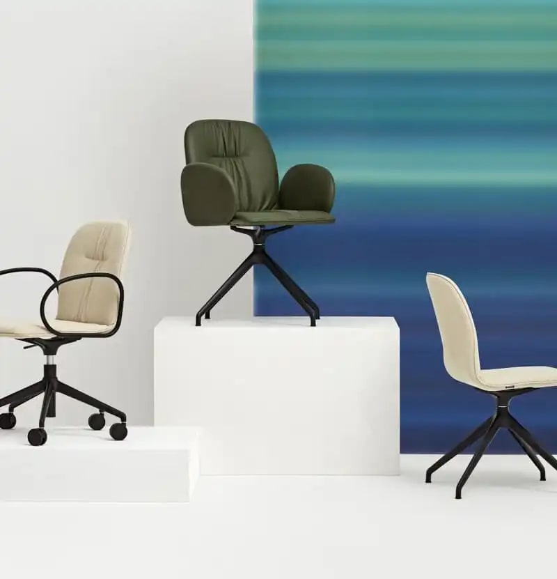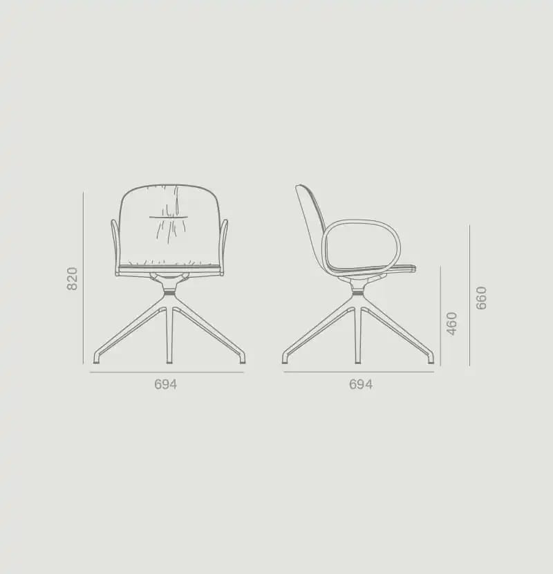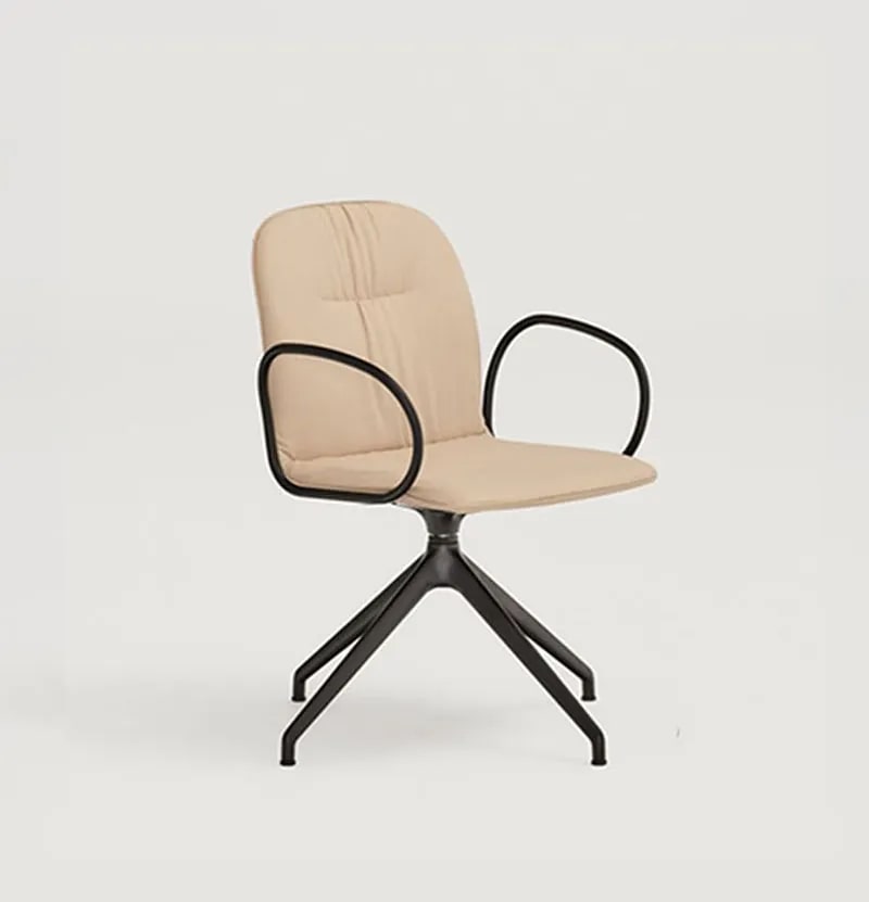 Мягкое кресло с алюминиевым основанием, поворотной системой и четырьмя спицами. Низкий корпус с металлическими подлокотниками. Обивка доступна в двух вариантах: стандартная или мягкая.