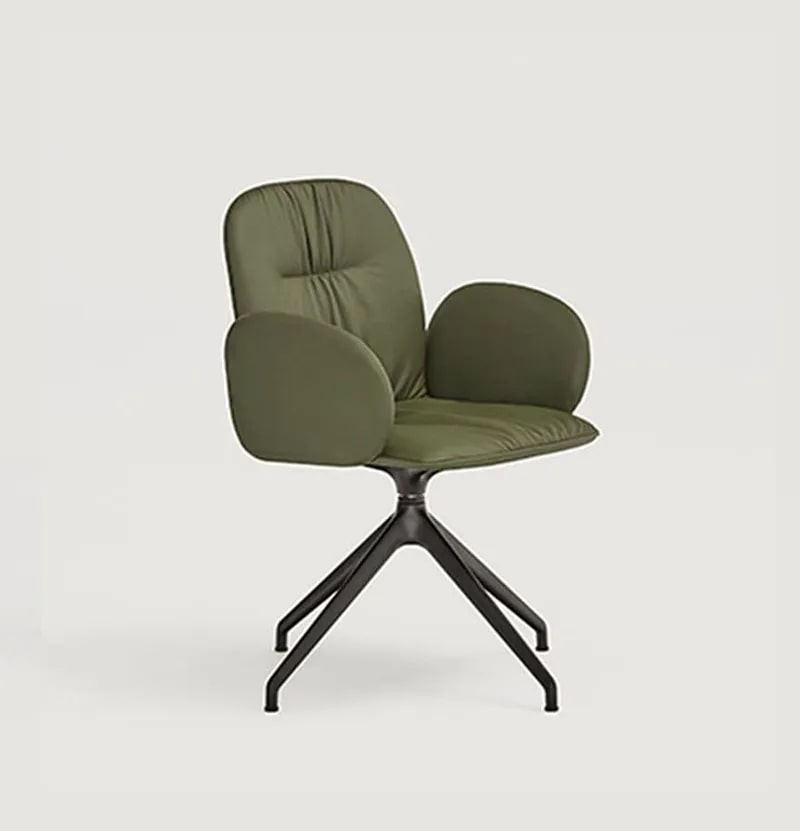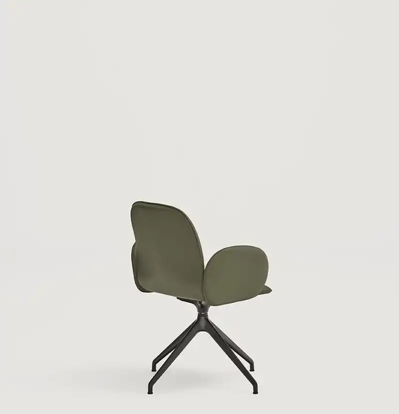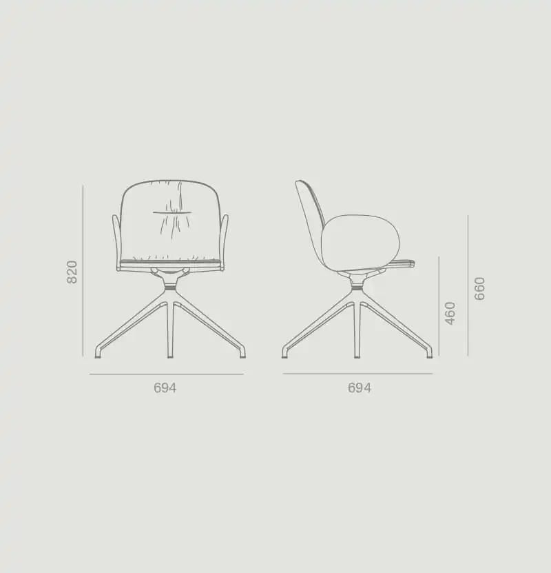 Мягкое кресло с алюминиевым основанием, поворотной системой и четырьмя спицами. Низкий кожух с мягкими подлокотниками. Обивка доступна в двух вариантах: стандартная или мягкая.