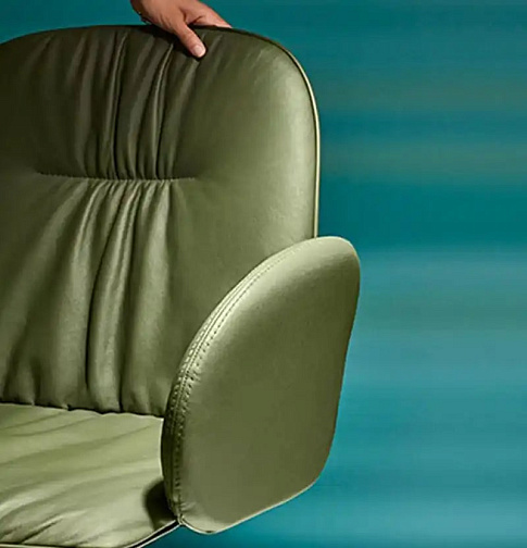 Мягкое кресло с алюминиевым основанием, поворотной системой, газовым подъемником и пятью спицами. Оборудовано поворотными роликами. Низкий кожух с мягкими подлокотниками. Обивка доступна в двух версиях: стандартная или мягкая.