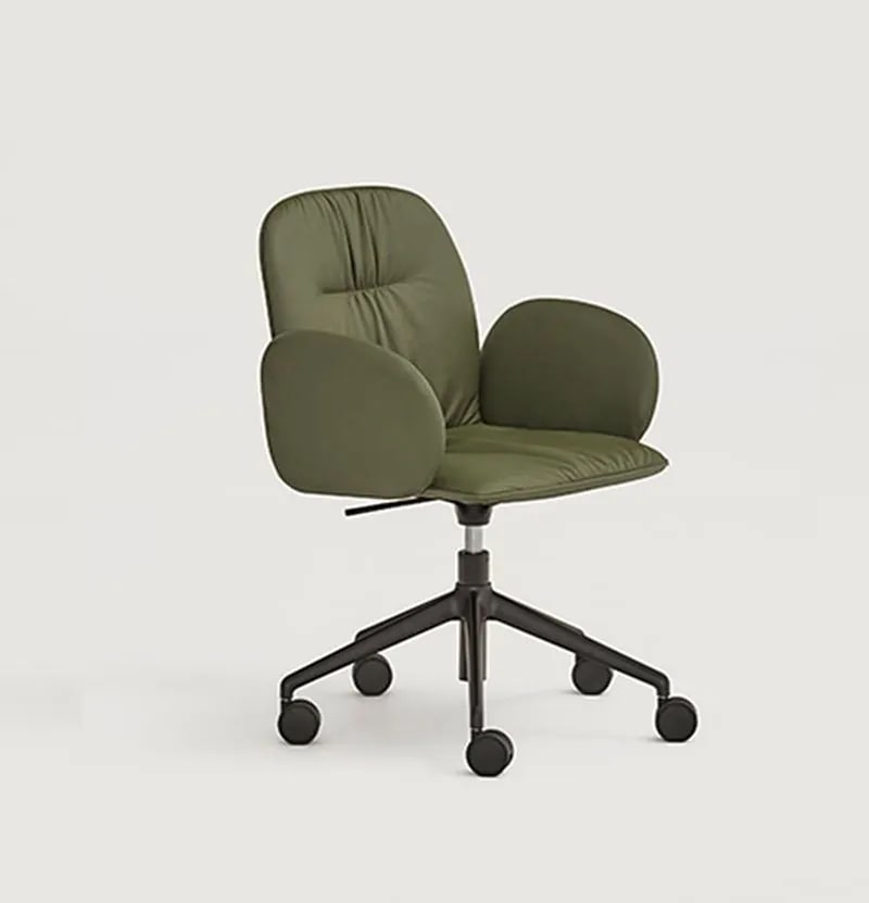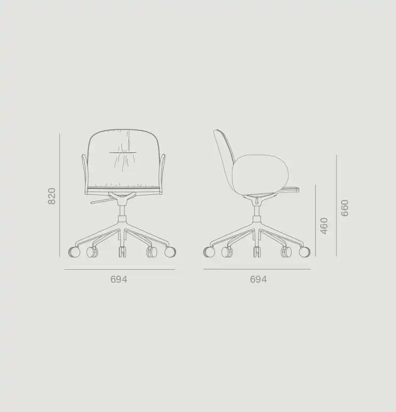 Мягкое кресло с алюминиевым основанием, поворотной системой, газовым подъемником и пятью спицами. Оборудовано поворотными роликами. Низкий кожух с мягкими подлокотниками. Обивка доступна в двух версиях: стандартная или мягкая.