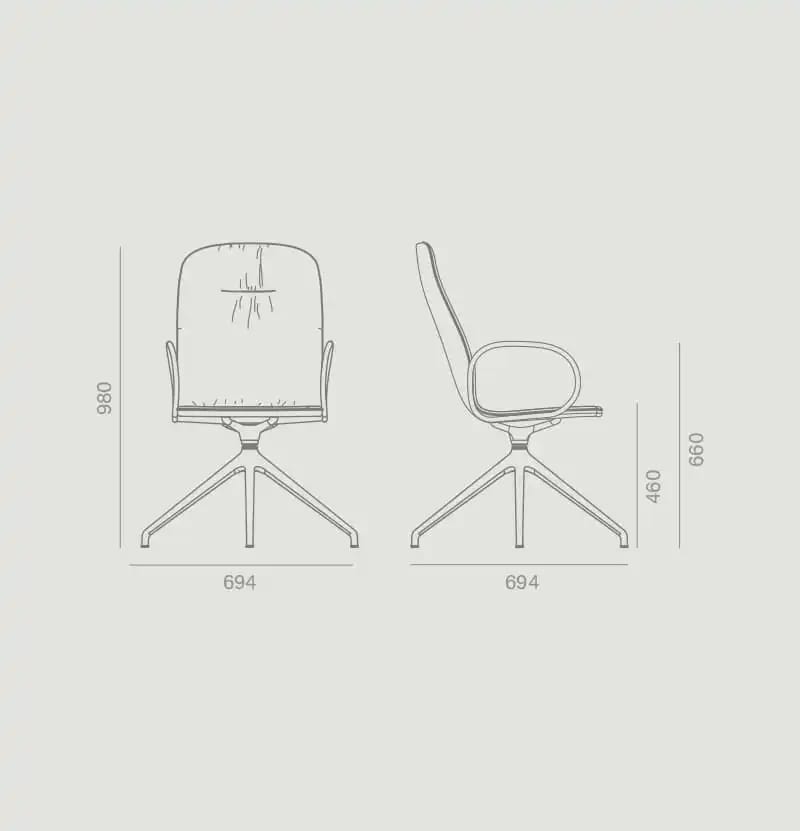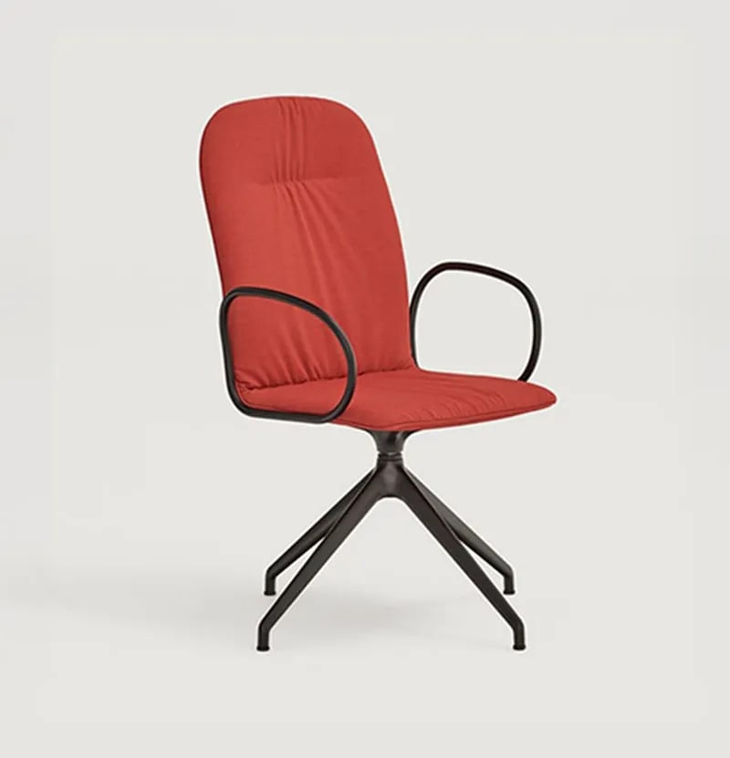 Мягкое кресло с алюминиевым основанием, поворотной системой и четырьмя спицами. Высокий каркас с металлическими кронштейнами. Мягкая обивка.