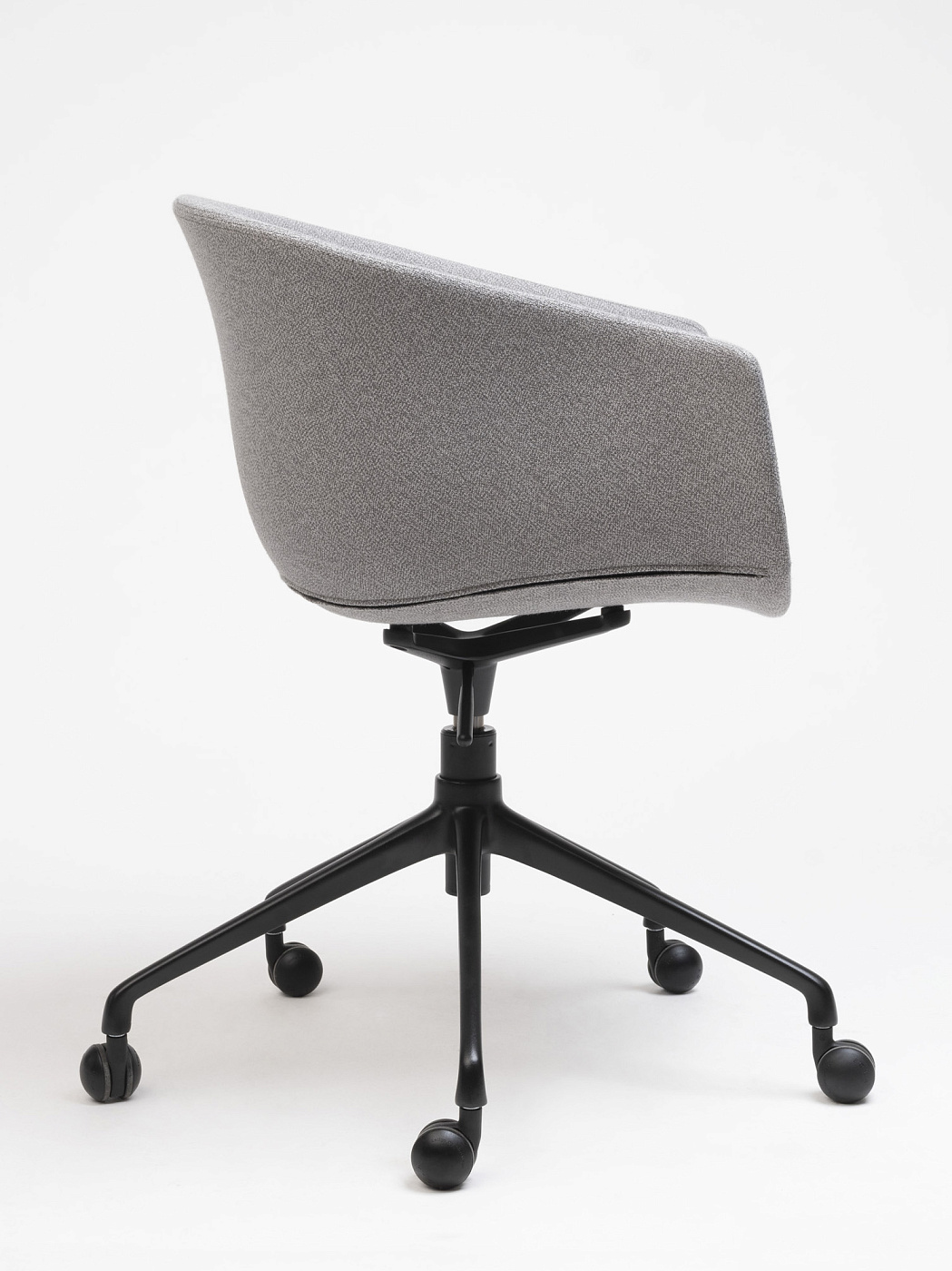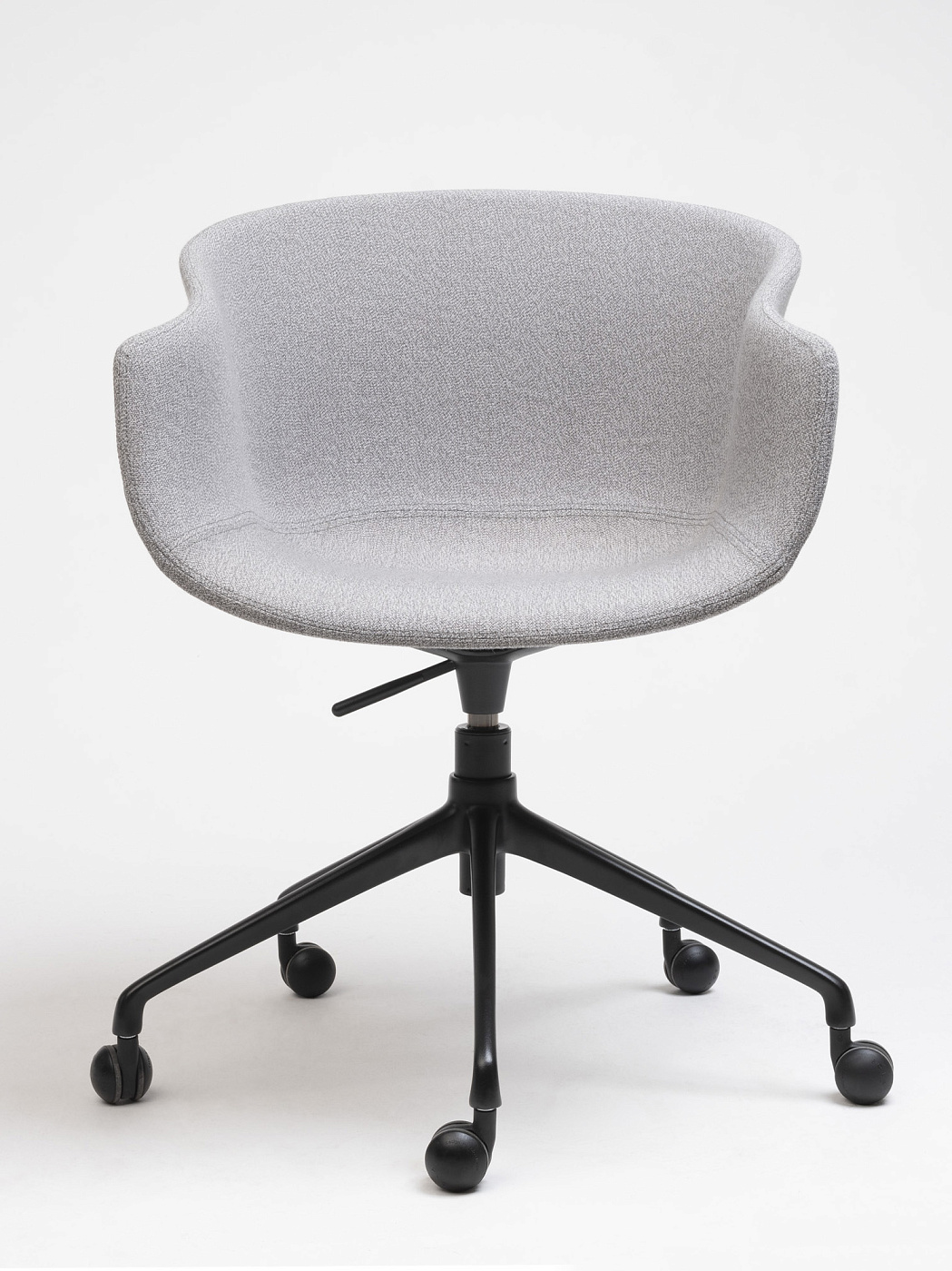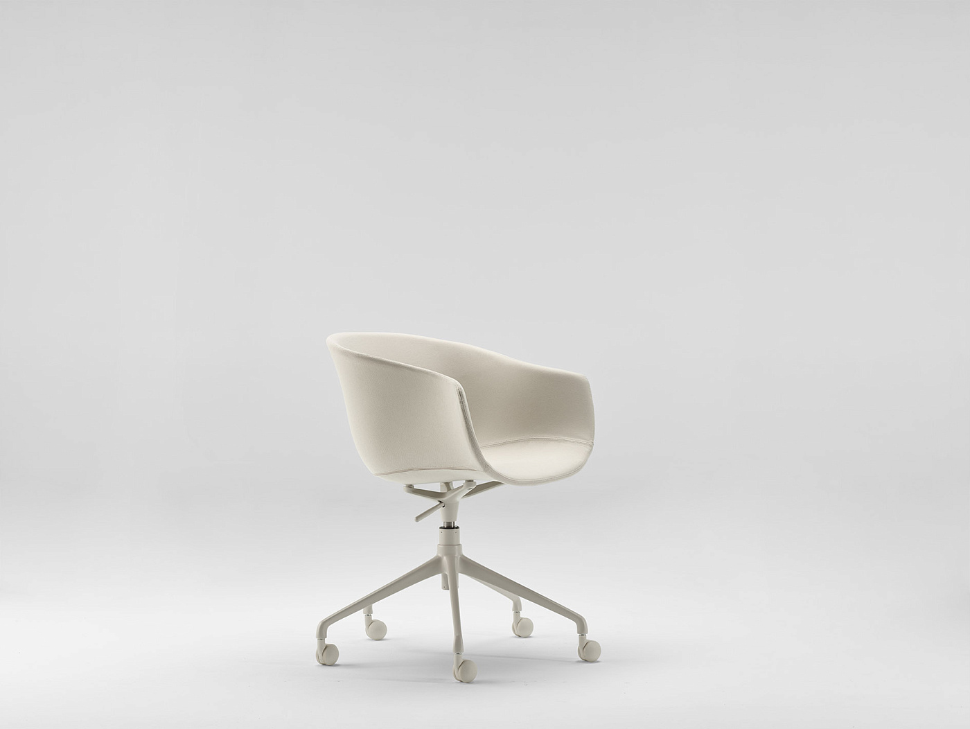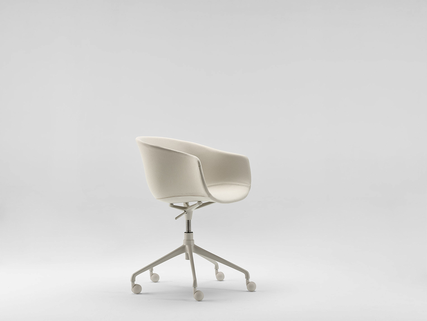 Обладая щедрыми пропорциями и обволакивающими линиями, это универсальное изделие благородного и теплого вида. Регулируемое вращающееся кресло Bai на колесиках, стальная конструкция, поддерживающая корпус мягкой органической формы из полипропилена или обивки.