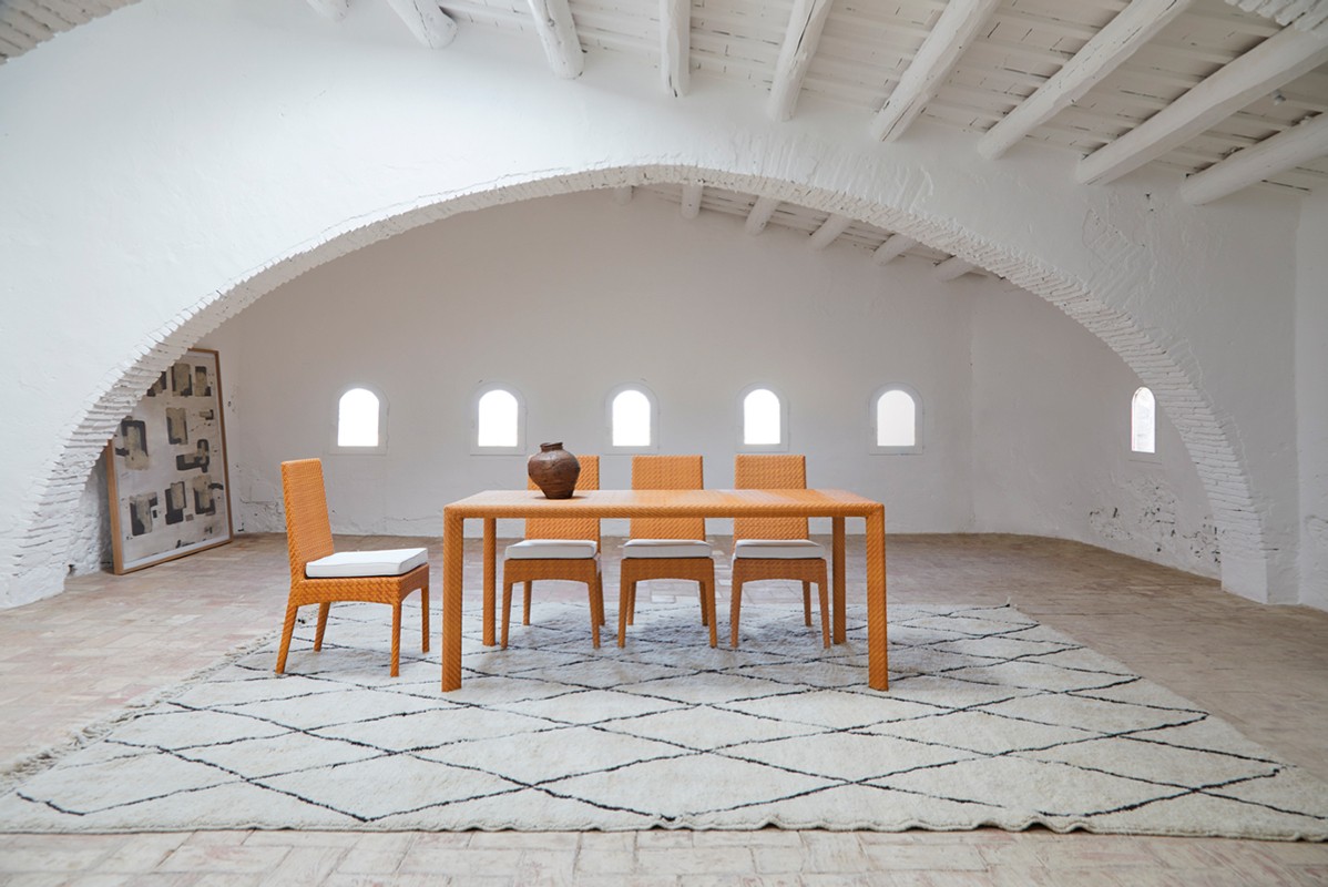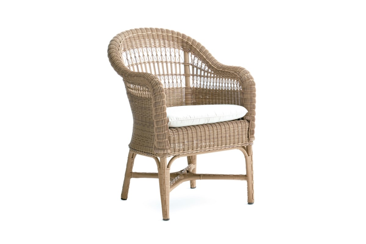 Обеденное кресло. Лакированная алюминиевая рама, плетение из волокна Shintotex круглой формы 3-4 миллиметра с отделкой. Тканевая подушка.