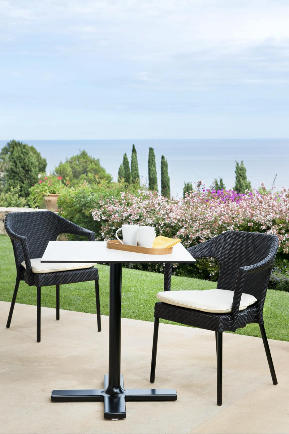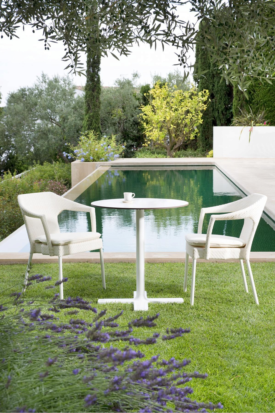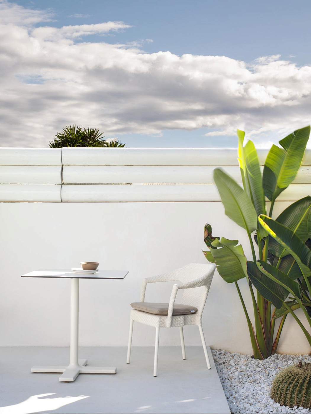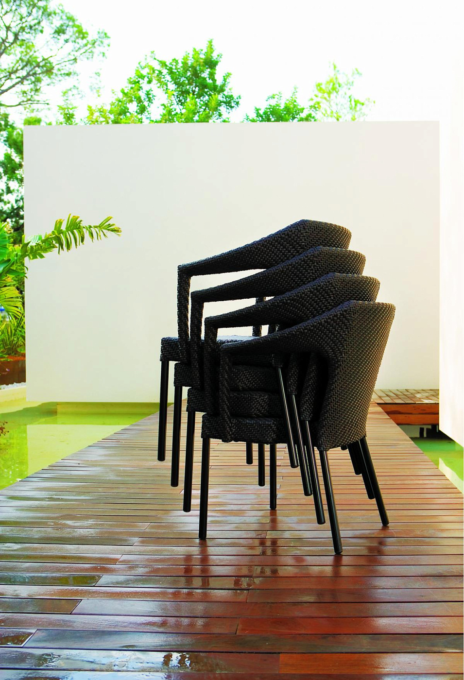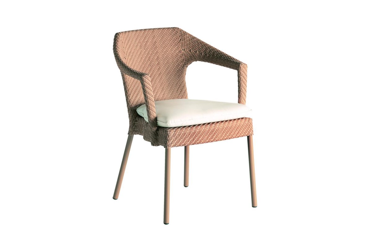 Штабелируемое обеденное кресло. Рама из лакированного алюминия, плоский овал 6 мм, плетение из волокна Shintotex. В трех вариантах отделки: 03 поджаренных, 36 слоновой кости или 59 черных. Подушка с высоким сопротивлением из пенополиуретана весом 35 кг с тканевым покрытием из сборника образцов Point.