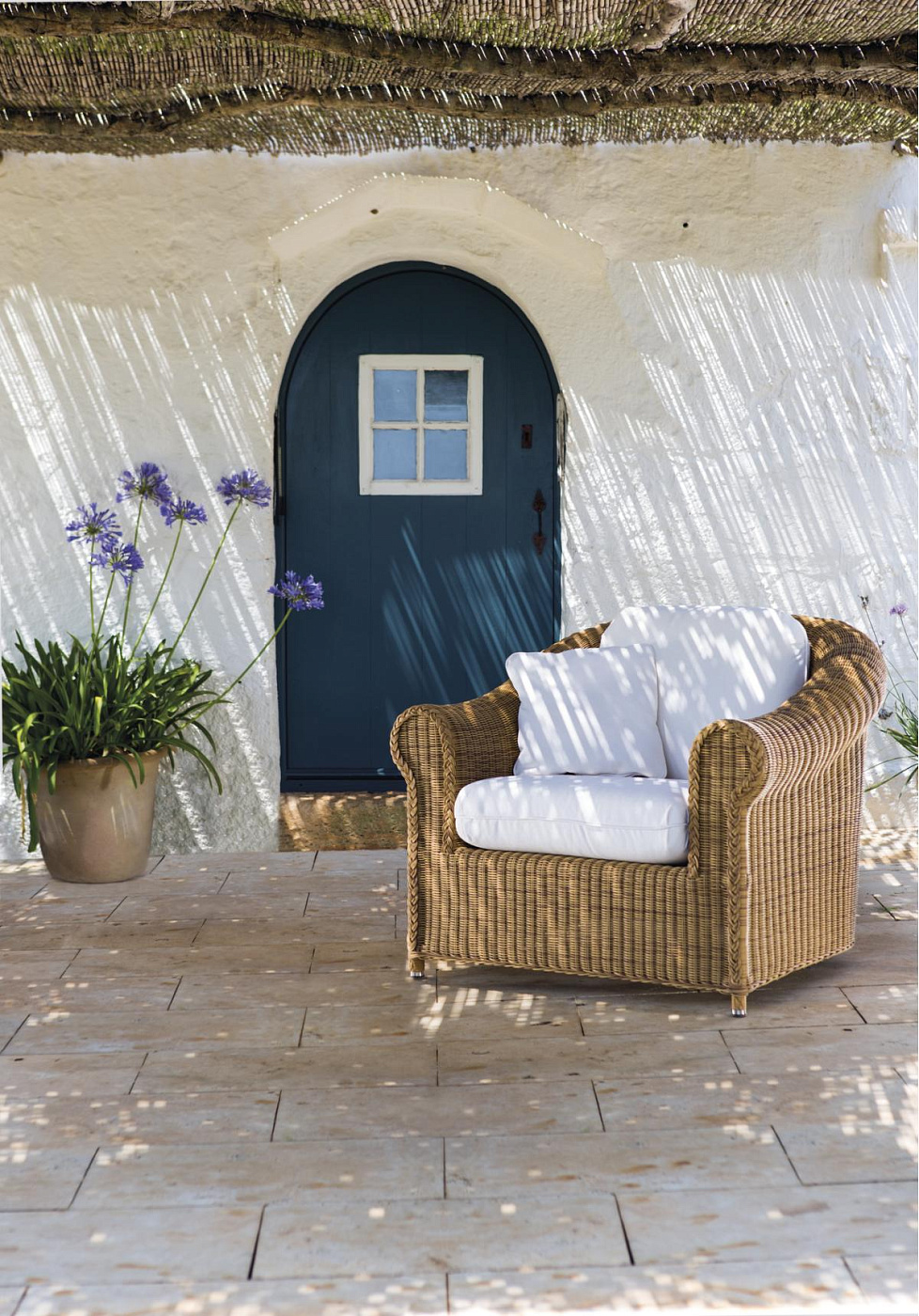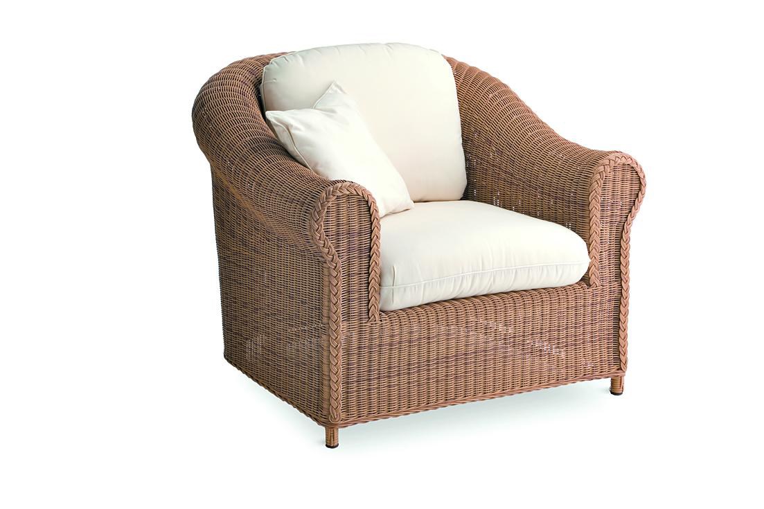 Кресло для отдыха. Рама из лакированного алюминия, плетение из волокна Shintotex круглой формы 3-4 миллиметра, отделка поджаренной поверхностью 03. Высокопрочные подушки из пенополиуретана весом 35 кг с тканевым покрытием из сборника образцов Point.