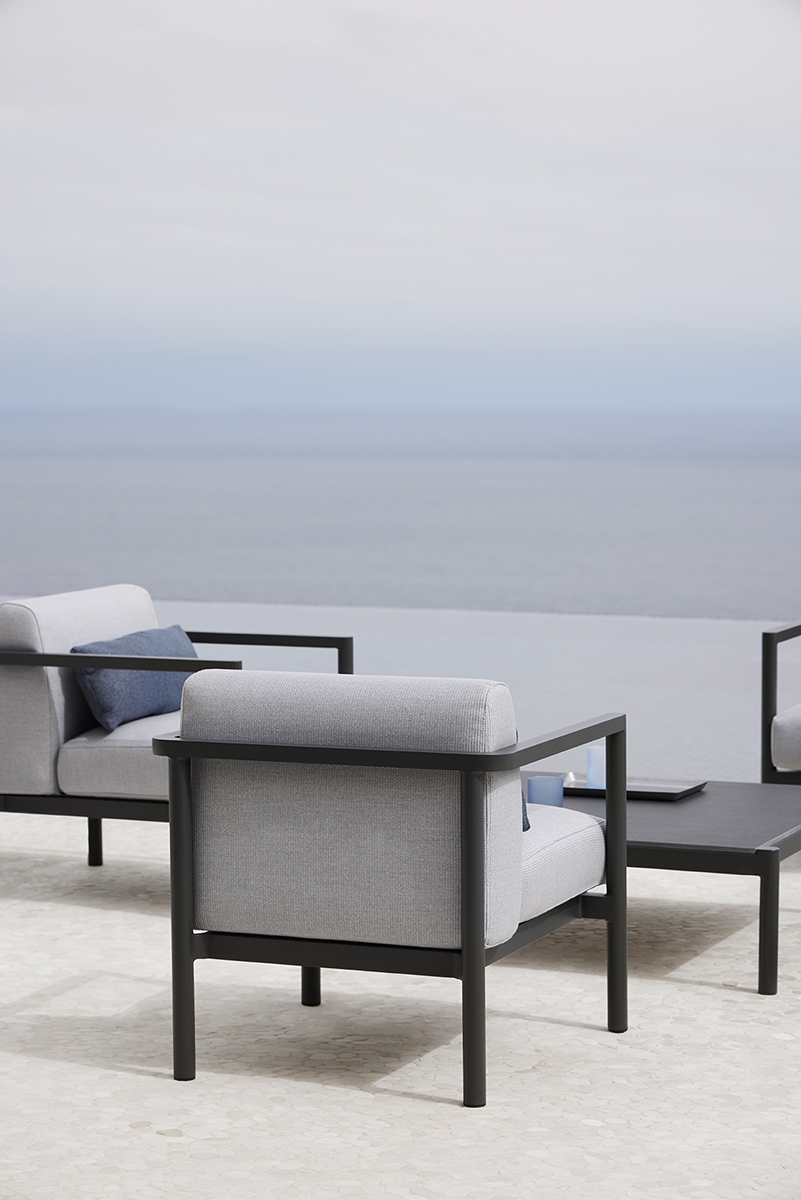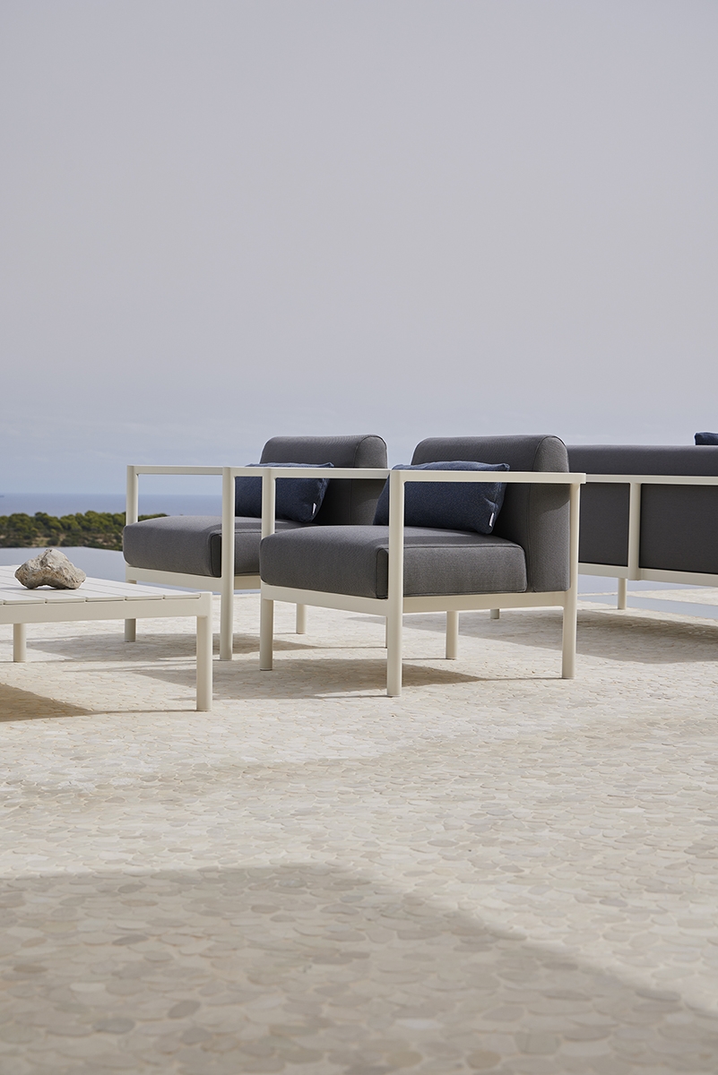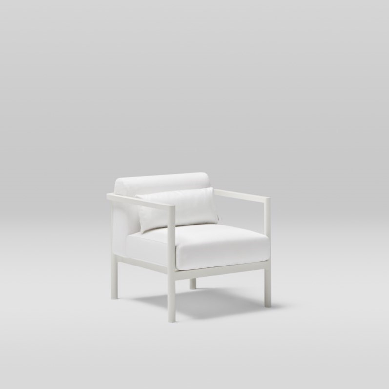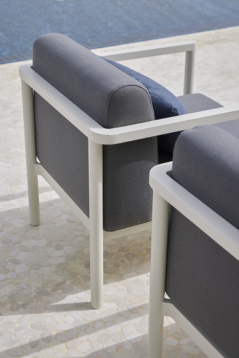 Кресло. Алюминиевая конструкция с порошковым покрытием доступна в цветах Cream 34 и Grey 56. Подушка сиденья и спинки из высокопрочного пенополиуретана весом 35 кг. Ткань для чехлов на подушки можно выбрать из различных тканей при настройке продукта на сайте. Вы также можете приобрести подушки без ткани или с собственной тканью.