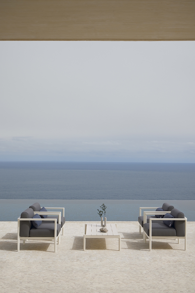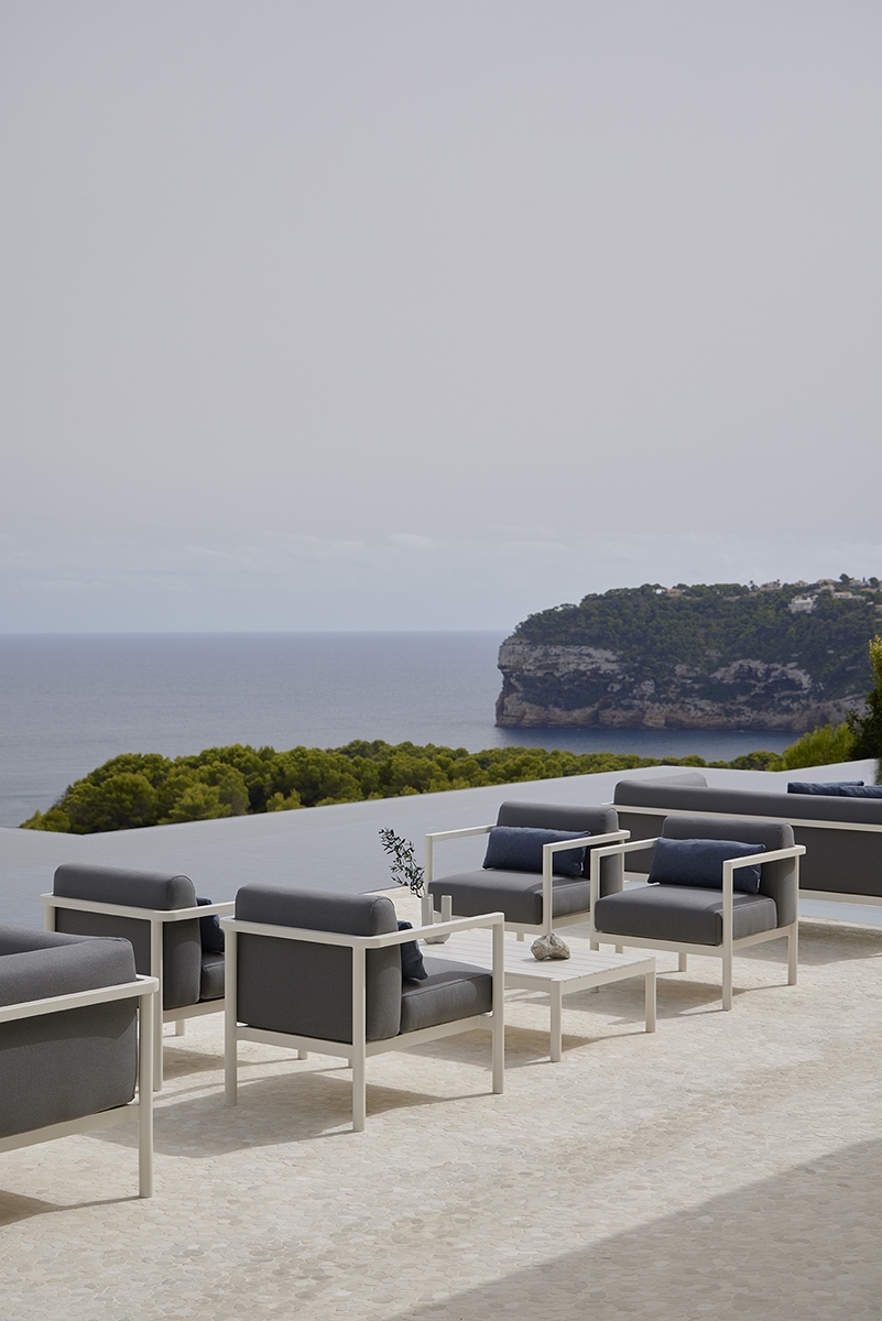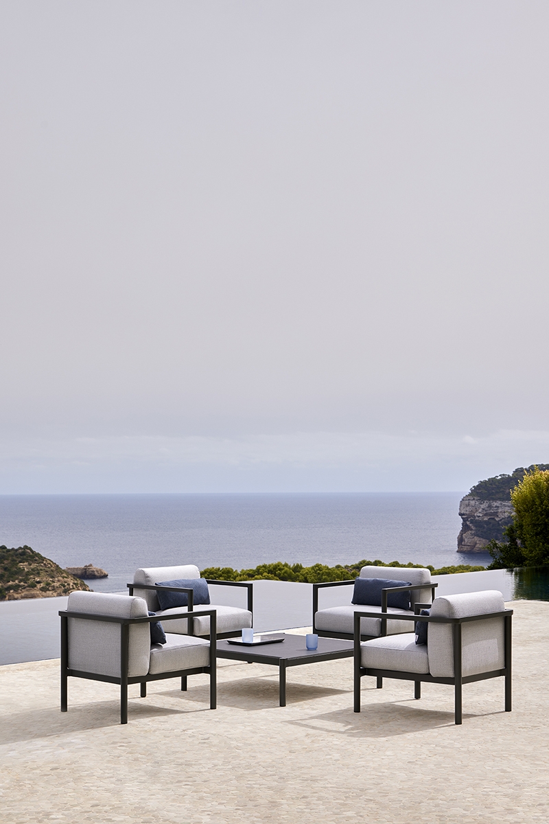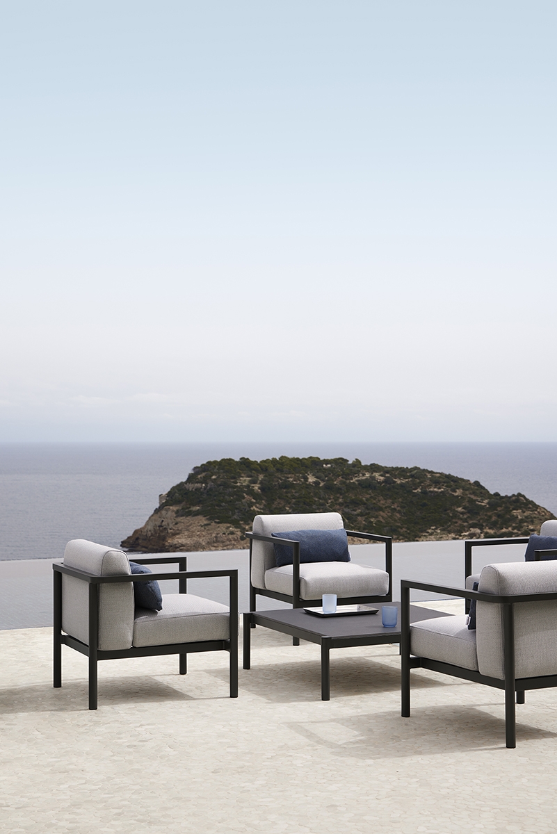 Кресло. Алюминиевая конструкция с порошковым покрытием доступна в цветах Cream 34 и Grey 56. Подушка сиденья и спинки из высокопрочного пенополиуретана весом 35 кг. Ткань для чехлов на подушки можно выбрать из различных тканей при настройке продукта на сайте. Вы также можете приобрести подушки без ткани или с собственной тканью.