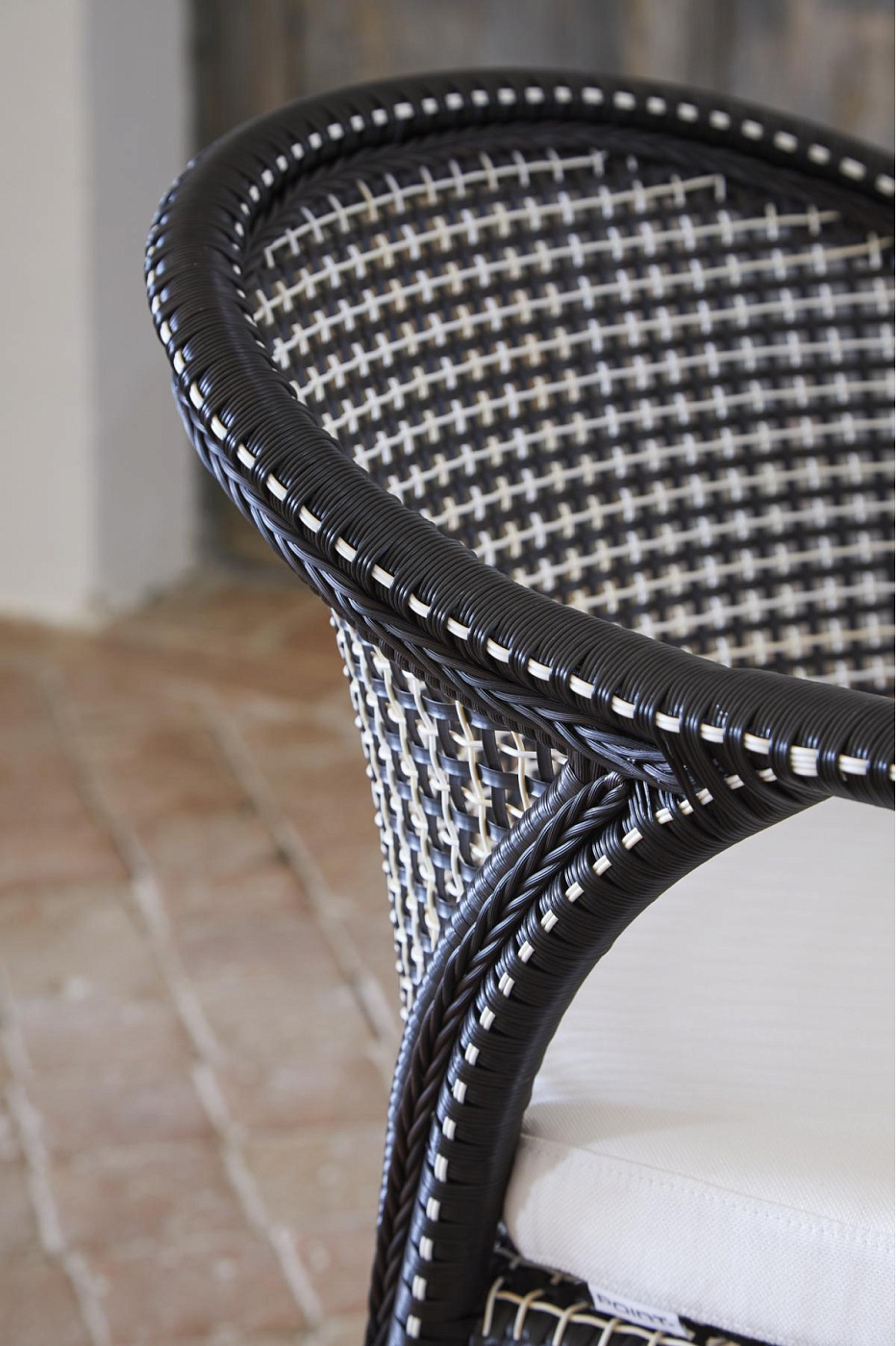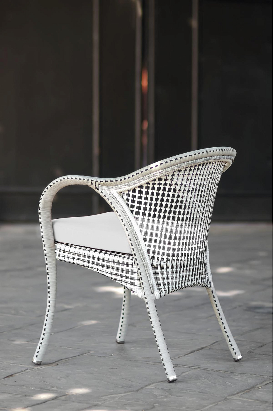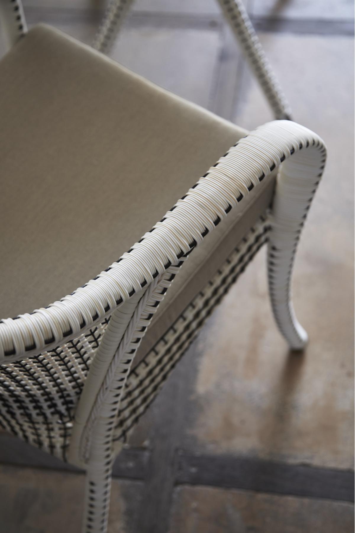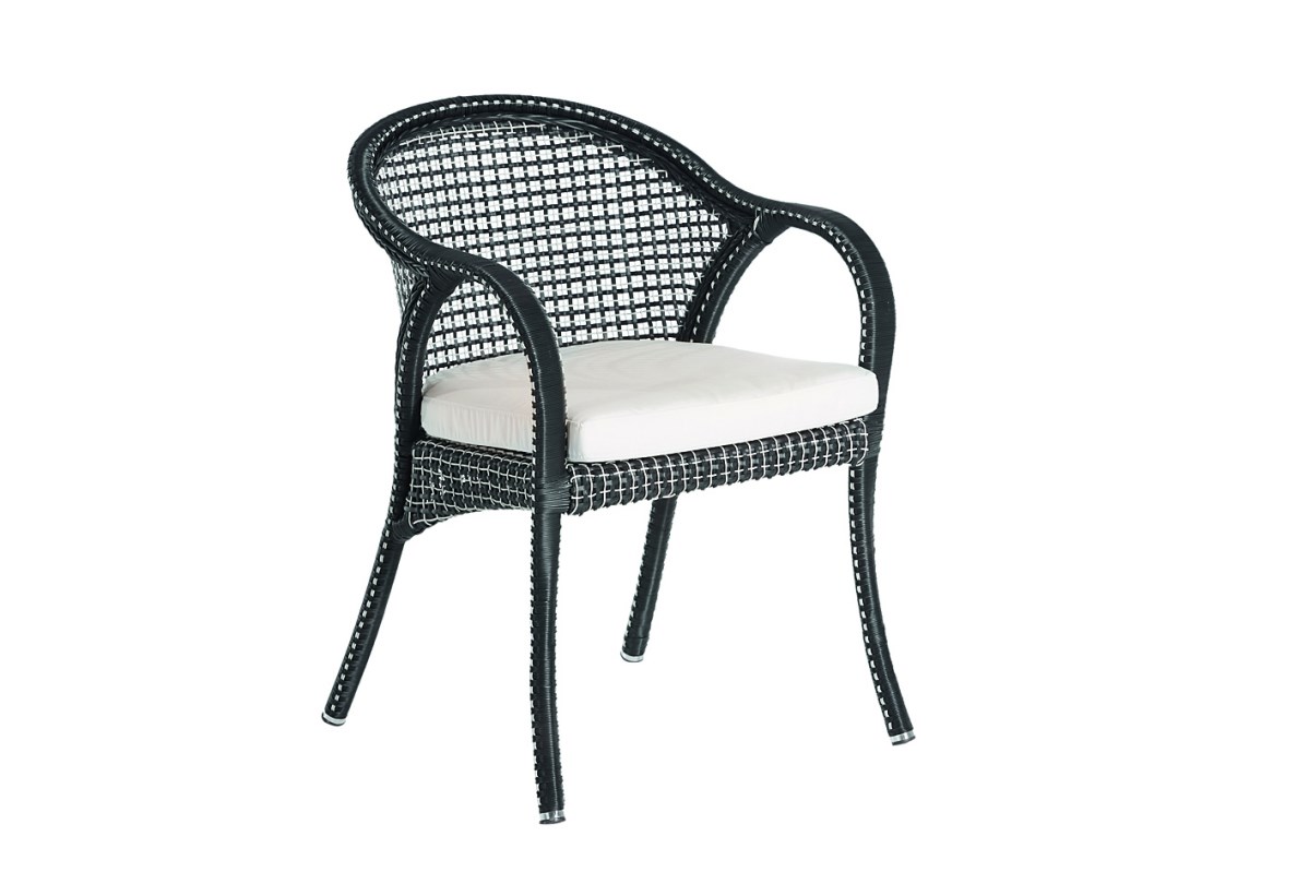 Обеденное кресло. Лакированная алюминиевая рама, плетение из волокна Shintotex, сочетание плоского овального 6-миллиметрового волокна с круглым 2-миллиметровым волокном. В двух вариантах отделки: 36 слоновой кости или 59 черных. Подушка с высоким сопротивлением из пенополиуретана весом 35 кг с тканевым покрытием из сборника образцов Point.