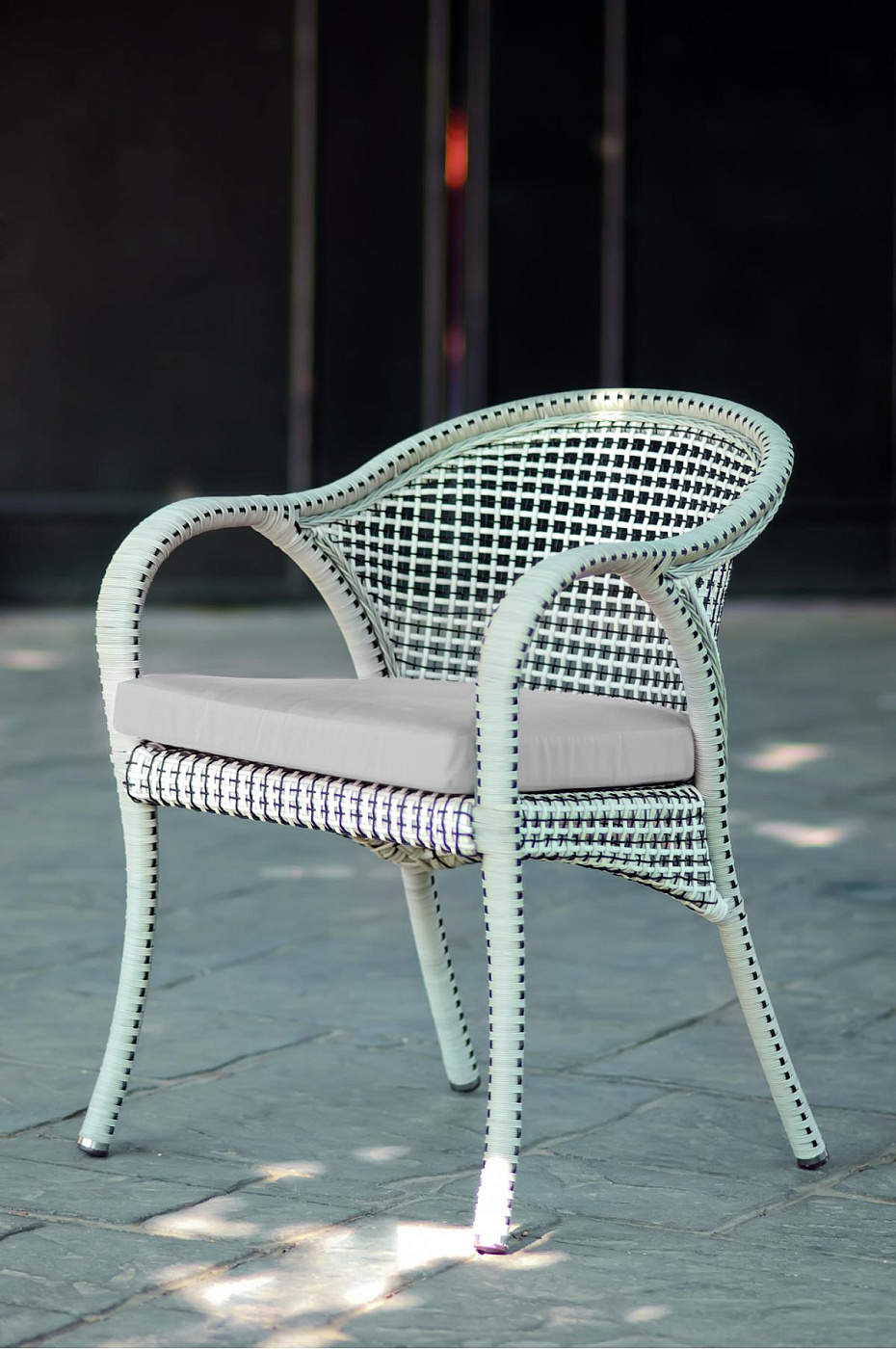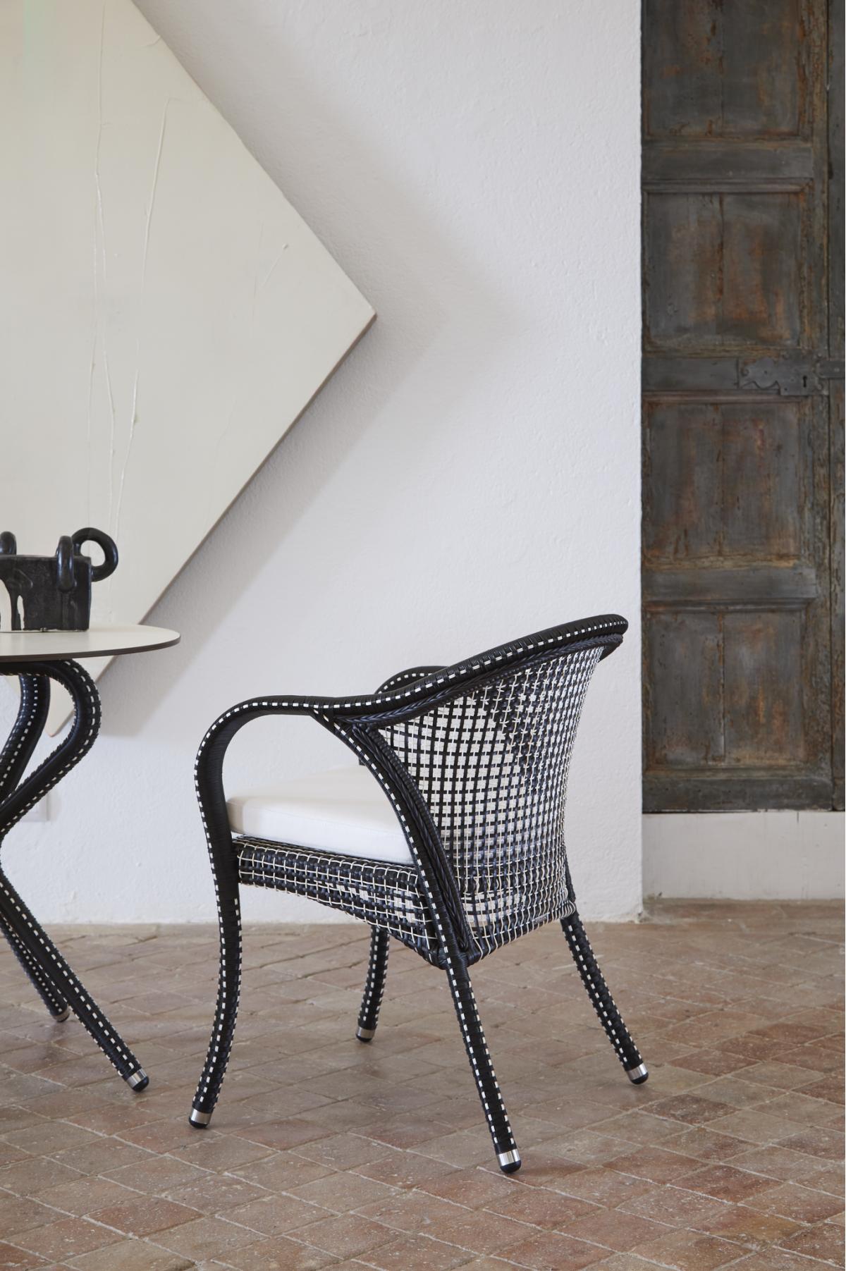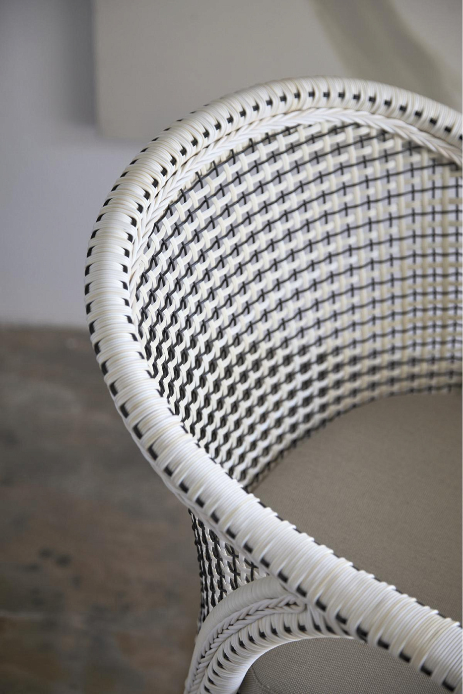 Обеденное кресло. Лакированная алюминиевая рама, плетение из волокна Shintotex, сочетание плоского овального 6-миллиметрового волокна с круглым 2-миллиметровым волокном. В двух вариантах отделки: 36 слоновой кости или 59 черных. Подушка с высоким сопротивлением из пенополиуретана весом 35 кг с тканевым покрытием из сборника образцов Point.