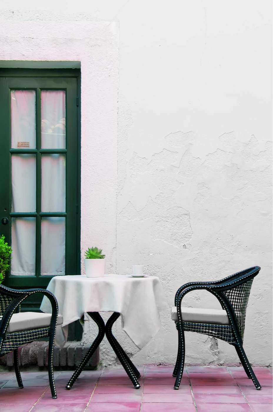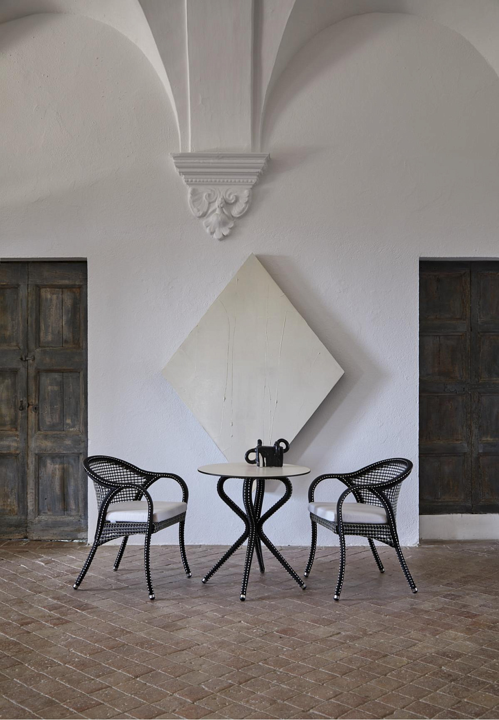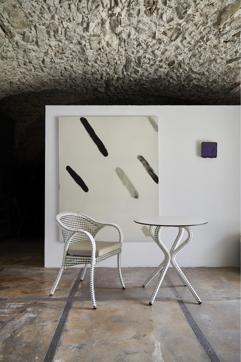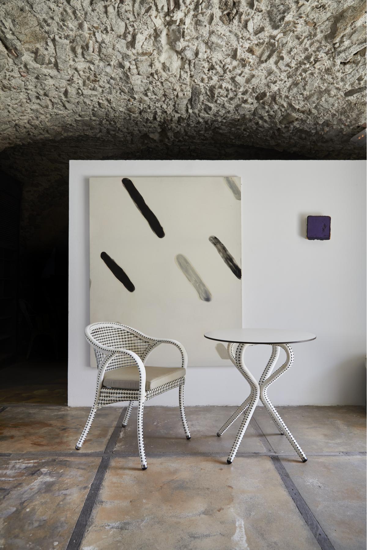 Обеденное кресло. Лакированная алюминиевая рама, плетение из волокна Shintotex, сочетание плоского овального 6-миллиметрового волокна с круглым 2-миллиметровым волокном. В двух вариантах отделки: 36 слоновой кости или 59 черных. Подушка с высоким сопротивлением из пенополиуретана весом 35 кг с тканевым покрытием из сборника образцов Point.