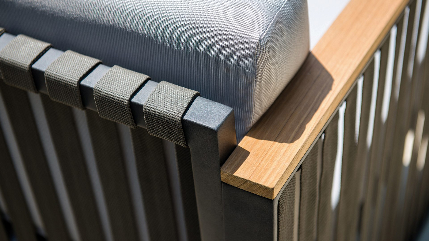 Одна из последних разработок в нашем новом каталоге. Сочетание черного алюминия, темно-серых ремешков и подлокотников из тикового дерева создает универсальную коллекцию, идеально подходящую как городским экстерьерам, так и пространствам для отдыха.