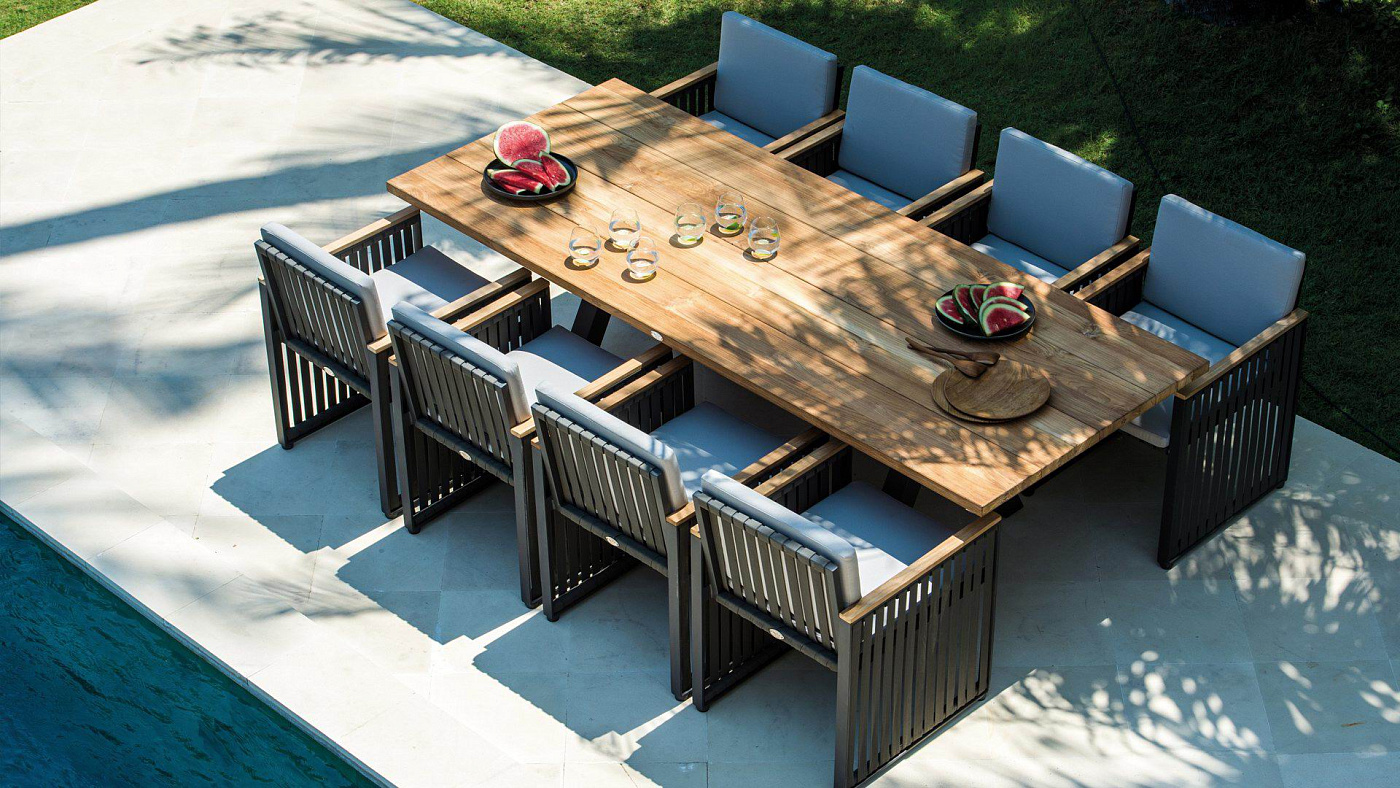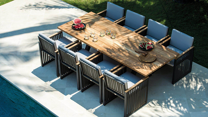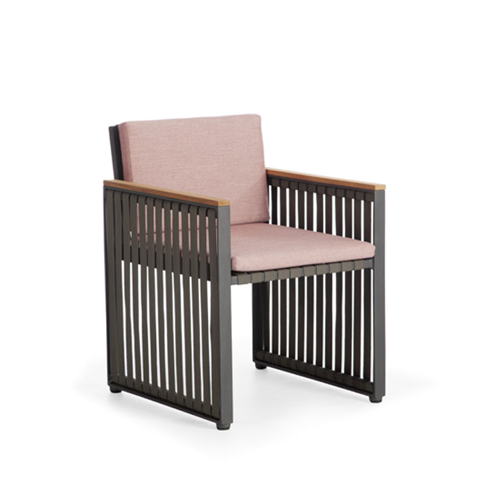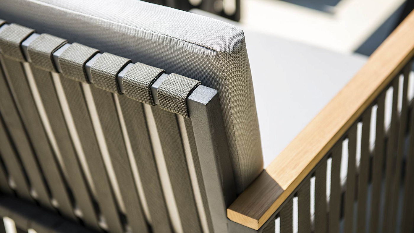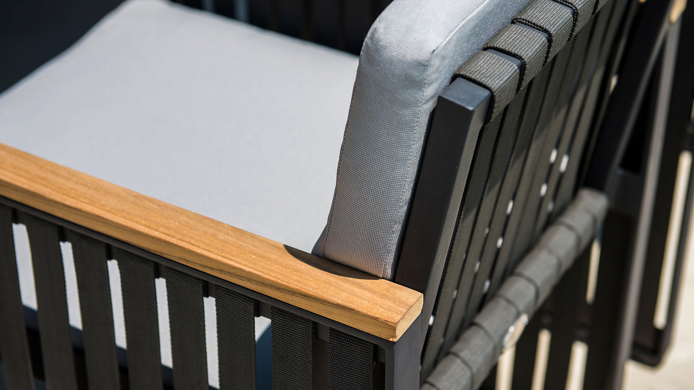 Одна из последних разработок в нашем новом каталоге. Сочетание черного алюминия, темно-серых ремешков и подлокотников из тикового дерева создает универсальную коллекцию, идеально подходящую как городским экстерьерам, так и пространствам для отдыха.