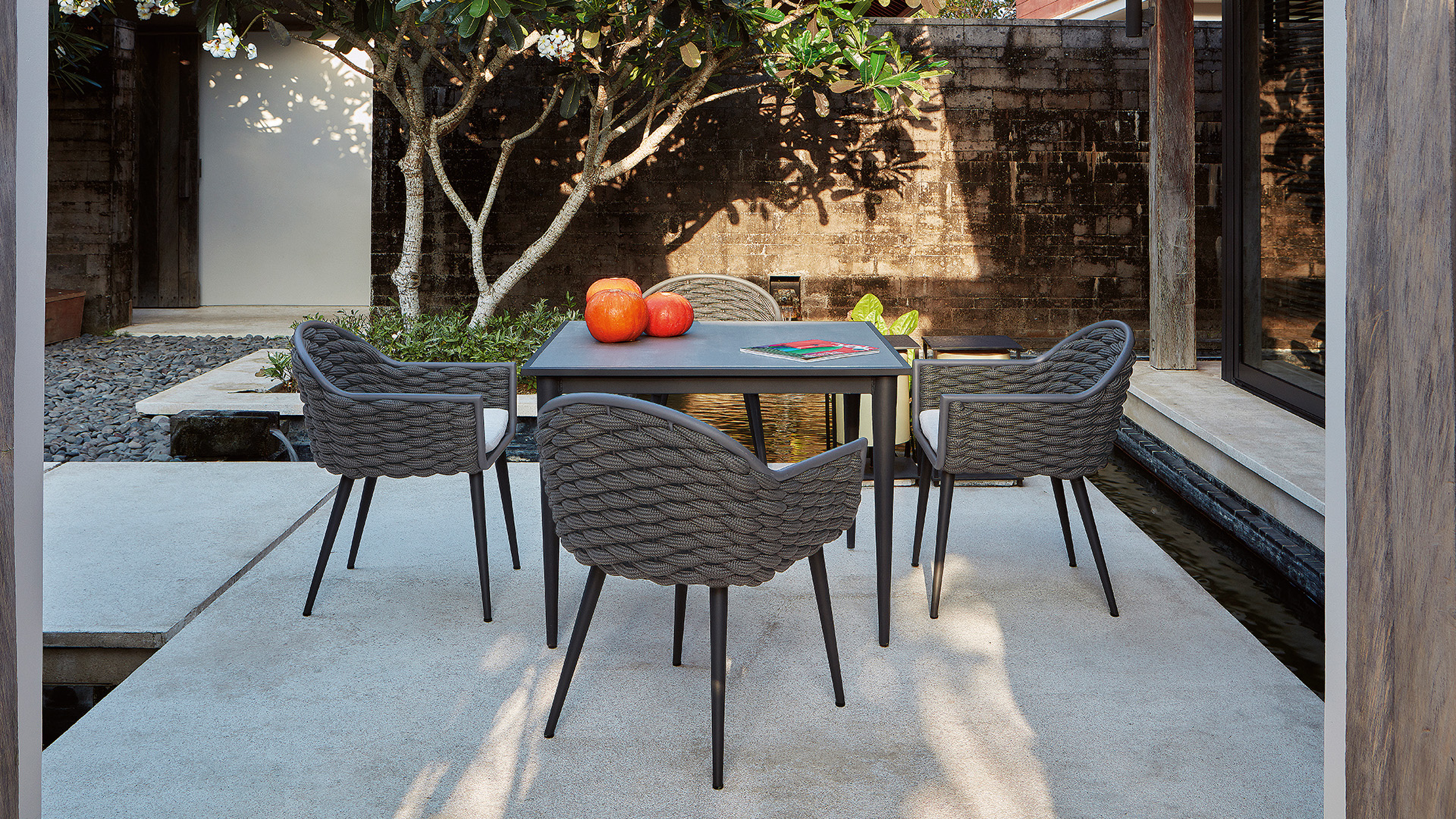 Современные органичные формы из алюминиевой рамы в сочетании с ручной оплёткой из синтетического шнура, делают эту коллекцию идеальным выбором для любого пространства.