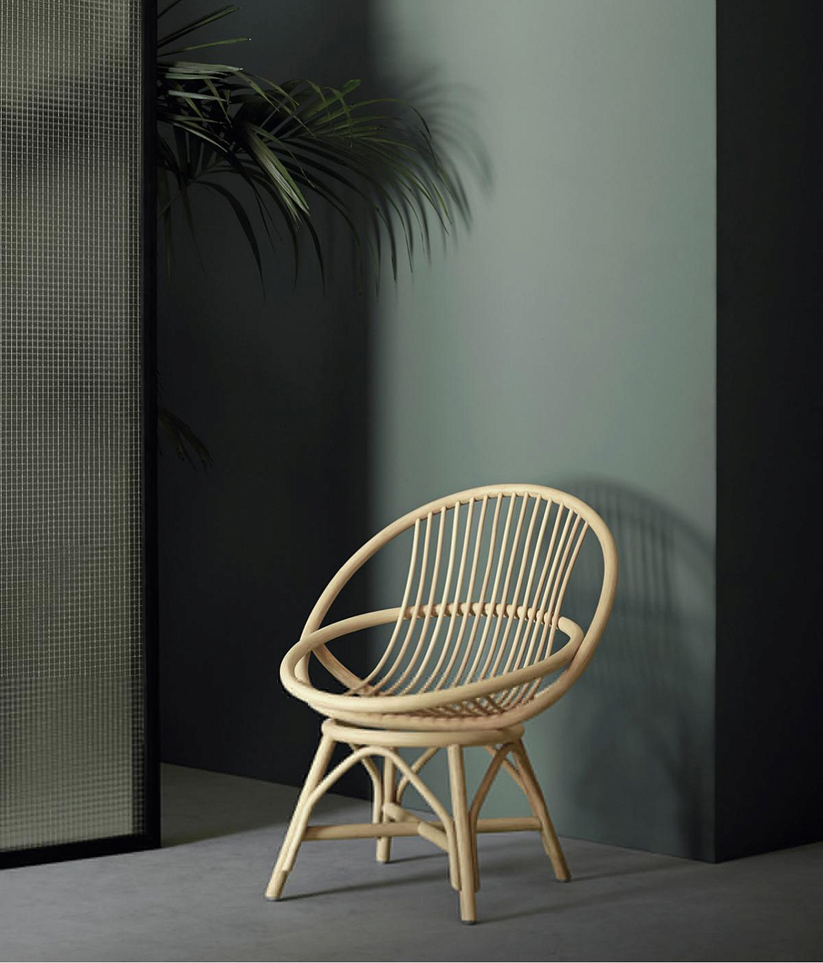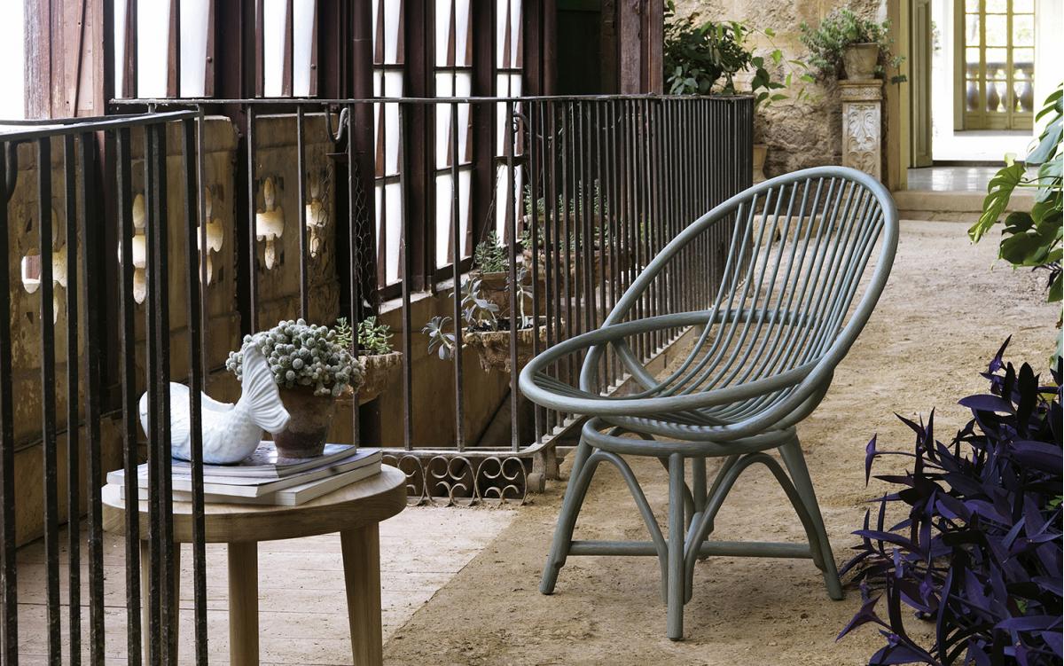 Кресло с каркасом из очищенного и тонированного натурального ротанга диаметром 28 мм/1,1 дюйма. Сиденье и спинка изготовлены из очищенного и тонированного натурального ротанга диаметром 10 мм/0,4 дюйма. Отделано трехступенчатым покрытием (краска, базовый слой и верхний слой), обладающим высокой устойчивостью к солнечному излучению благодаря УФ-фильтрам. Дополнительная подушка с обивкой из натуральной или искусственной кожи, тканей из натуральной шерсти, бархата и полипропилена. Защитные колпачки.
