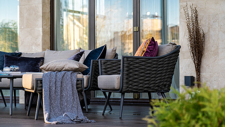 Современные органичные формы из алюминиевой рамы в сочетании с ручной оплёткой из синтетического шнура, делают эту коллекцию идеальным выбором для любого пространства.