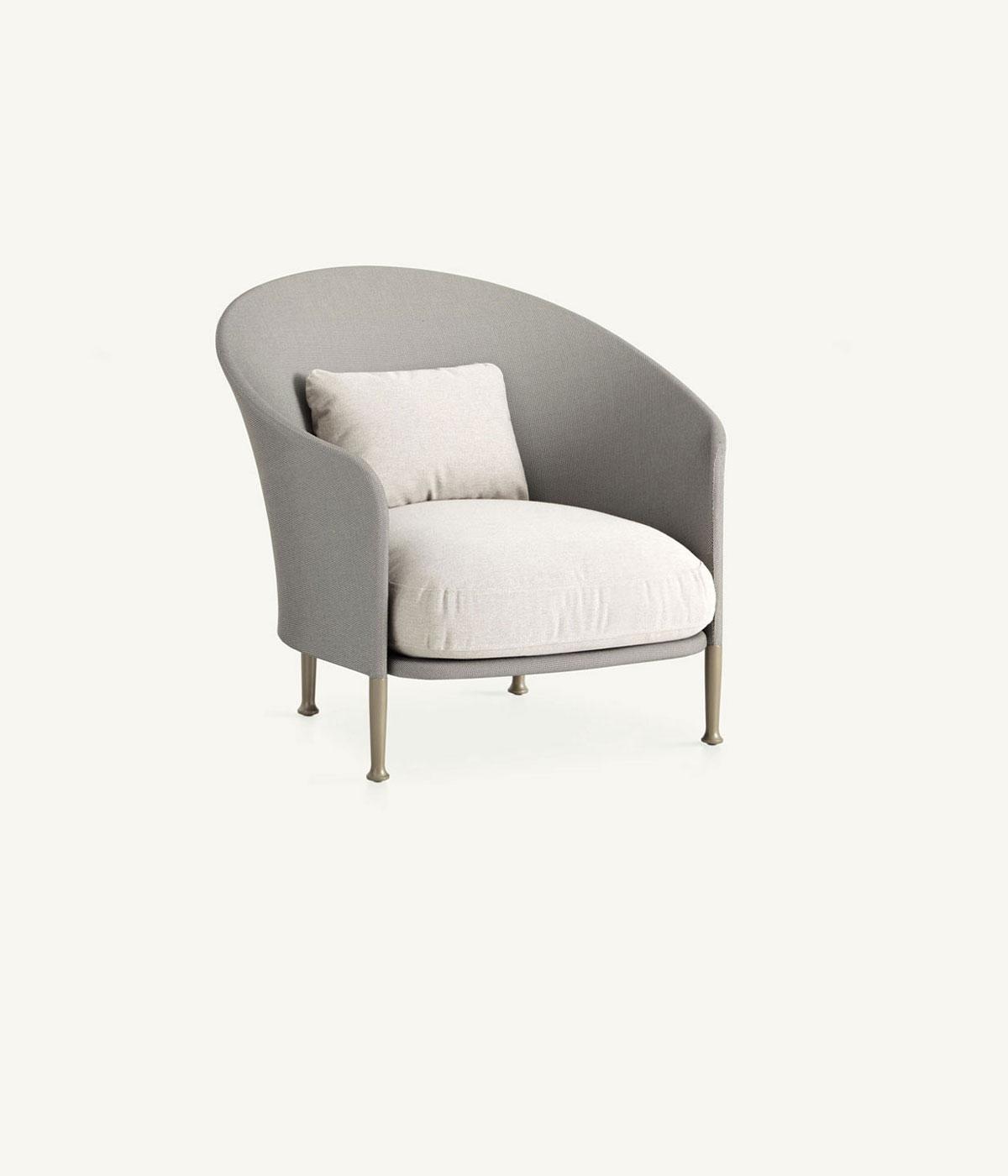 Низкое кресло со структурой из высокопрочной алюминиевой трубы и литыми алюминиевыми ножками. Возможность индивидуальной настройки благодаря широкому выбору технических тканей, полностью подходящих для использования на открытом воздухе.