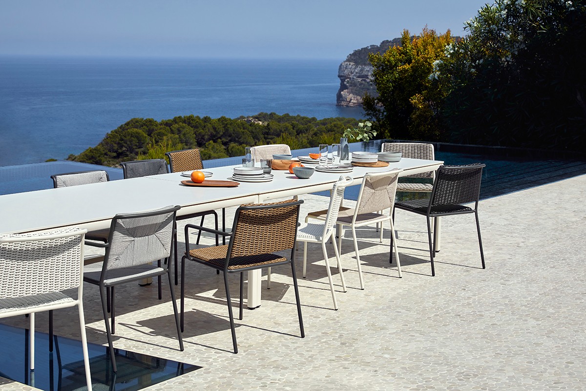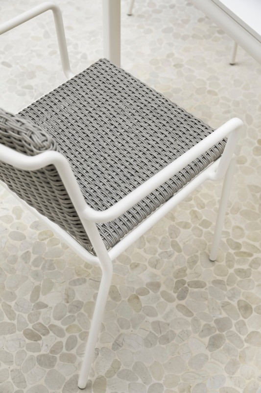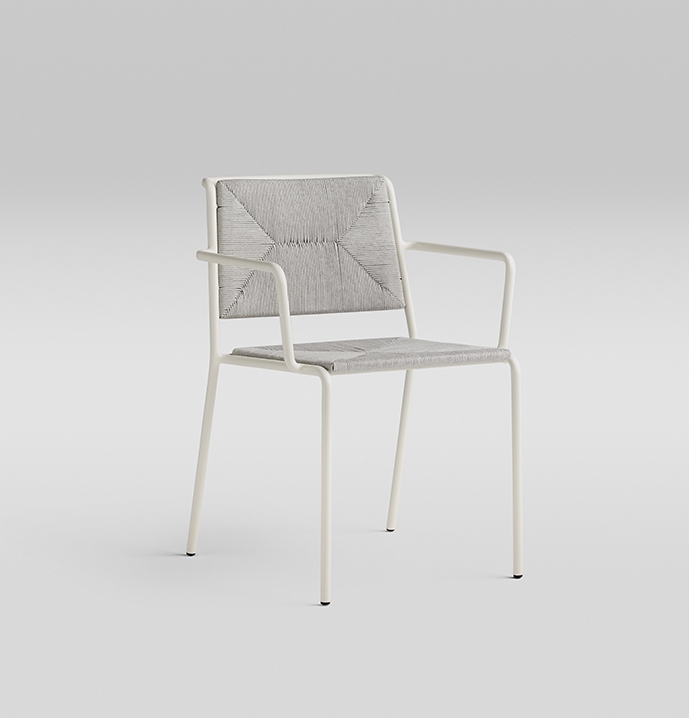 Штабелируемое кресло с алюминиевой рамой с порошковым покрытием. Сиденье и спинка из синтетического волокна Shintotex® или полиэфирного каната толщиной 4 мм. Алюминиевая отделка кремового цвета 34. Отделка синтетическим волокном Shintotex® четырех цветов: белый, серебристо-серый, каштаново-коричневый, темно-серый. Канатная отделка трех цветов: бежевый, жемчужно-серый, графит.