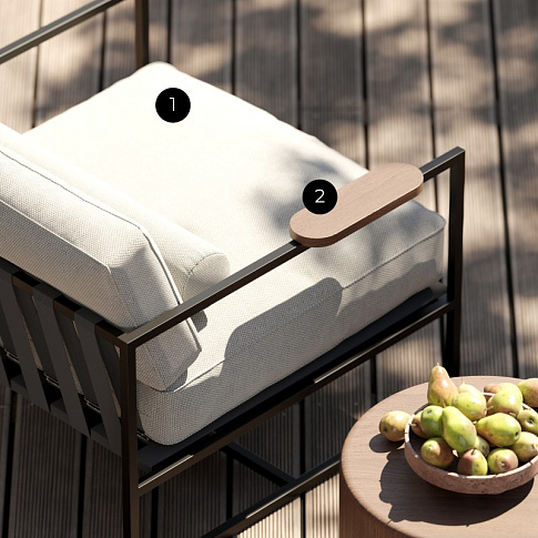 Универсальное и стильное уличное кресло Badi может выделяться отдельно или сочетаться с диванами и пуфами Badi для создания уютных зон комфорта на открытом воздухе. Благодаря текстурированному каркасу из черного железа и тканевой обивке это кресло обеспечивает длительный комфорт и стиль, которые украсят любое открытое пространство.