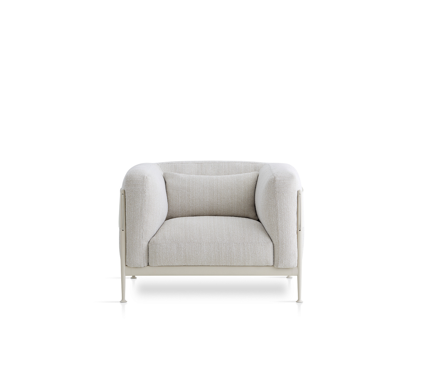 Кресло со структурой из высокопрочного алюминиевого профиля и ножками из литого алюминия, покрытыми полиэфирной пудрой. Ремень из технической ткани Zander. Возможность персонализации благодаря широкому выбору технических тканей, полностью подходящих для использования на открытом воздухе.