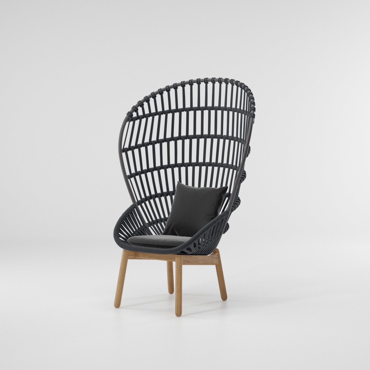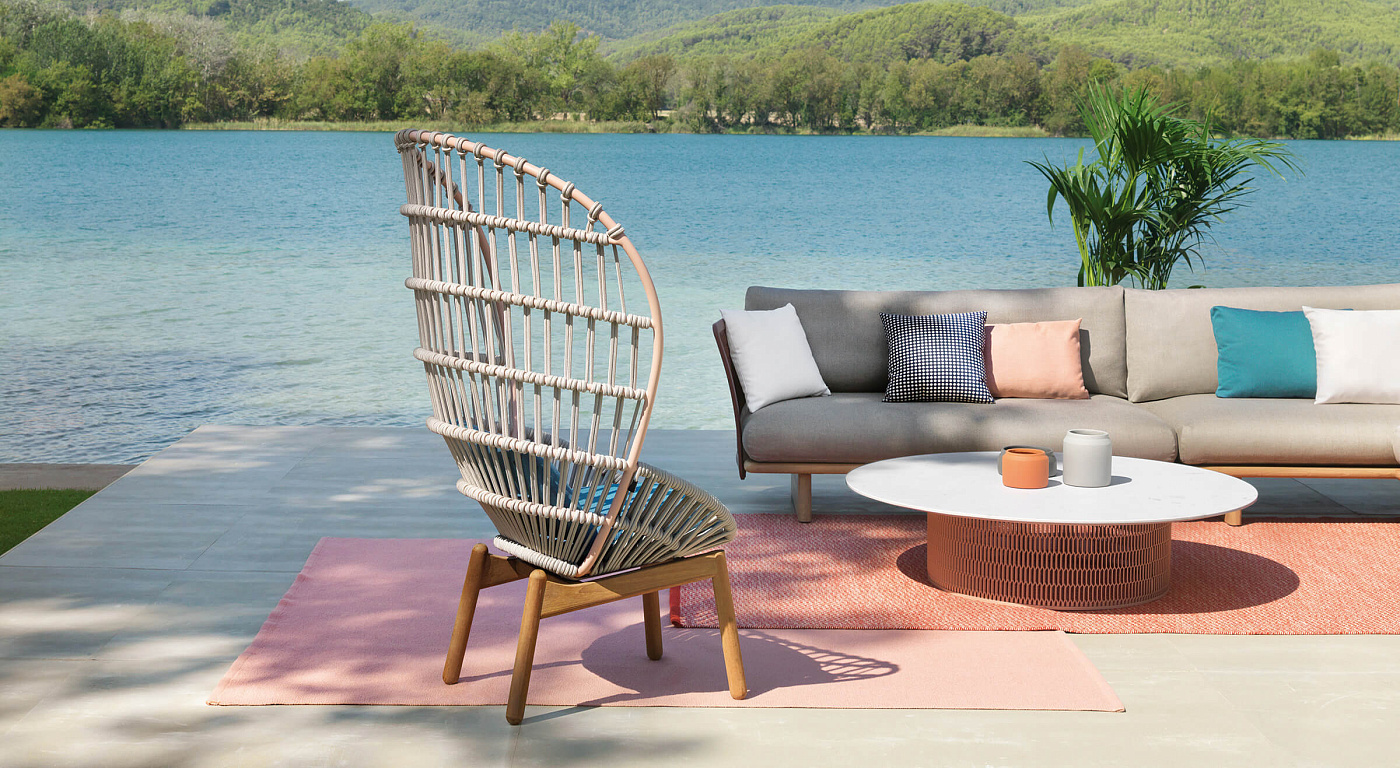Cala’ - это кресло с высокой спинкой, вдохновленное культовым Эммануэль. Кресло обладает величественным пространственным присутствием благодаря прозрачным и светлым поверхностям. Открытое переплетение веревки создает решетчатое окно для визуальной приватности, сохраняя при этом связь с природными элементами. "Кала" может использоваться как для обедов на открытом воздухе, так и в качестве кресла для отдыха . Широкий выбор металлических покрытий, цветов канатов и тканей для подушек открывает множество возможностей для придания индивидуальности креслу в соответствии с различными проектами. Каркас сиденья Cala изготовлен из алюминиевых профилей с покрытием. Плетение представляет собой завязанную узлом веревку. Стул поставляется с двумя вариантами ножек из тикового дерева или алюминиевой подставкой-основанием. Коллекция Cala включает в себя обеденный стул, серию столов, низкие скамеечки для ног, двух- и трехместный диван. Обеденный стол имеет монолитный и смелый вид, создавая контраст с легкостью стульев. Такую же каркасную конструкцию можно распознать в низких столиках и скамеечках для ног.