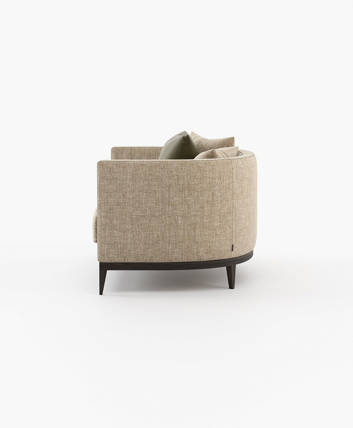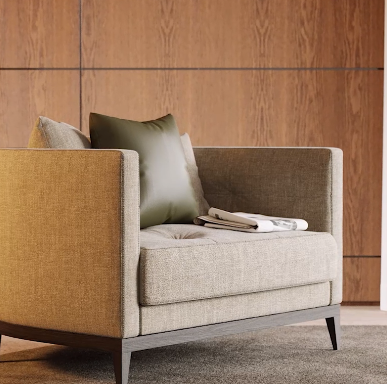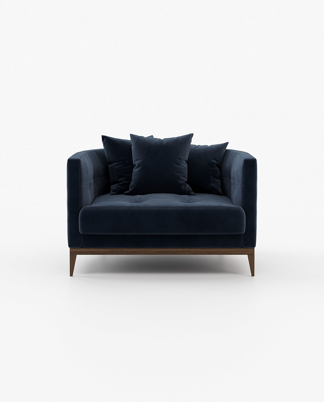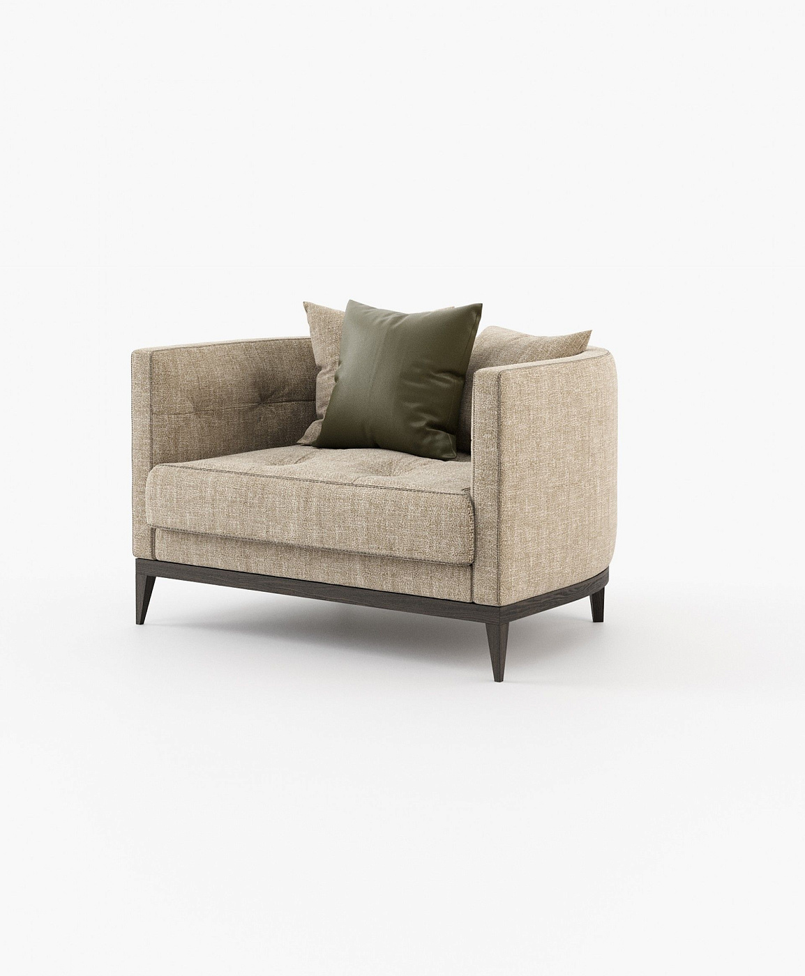 Мягкое кресло с деревянной основой, с подлокотниками и ножками по прямым линиям спереди и закругленной структурой сзади, создающими внушительное и комфортное ощущение.