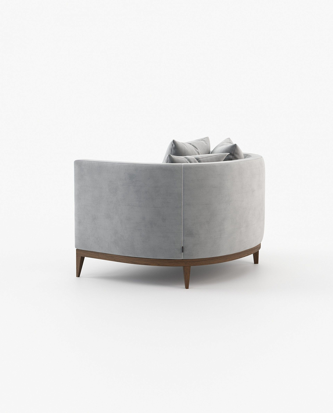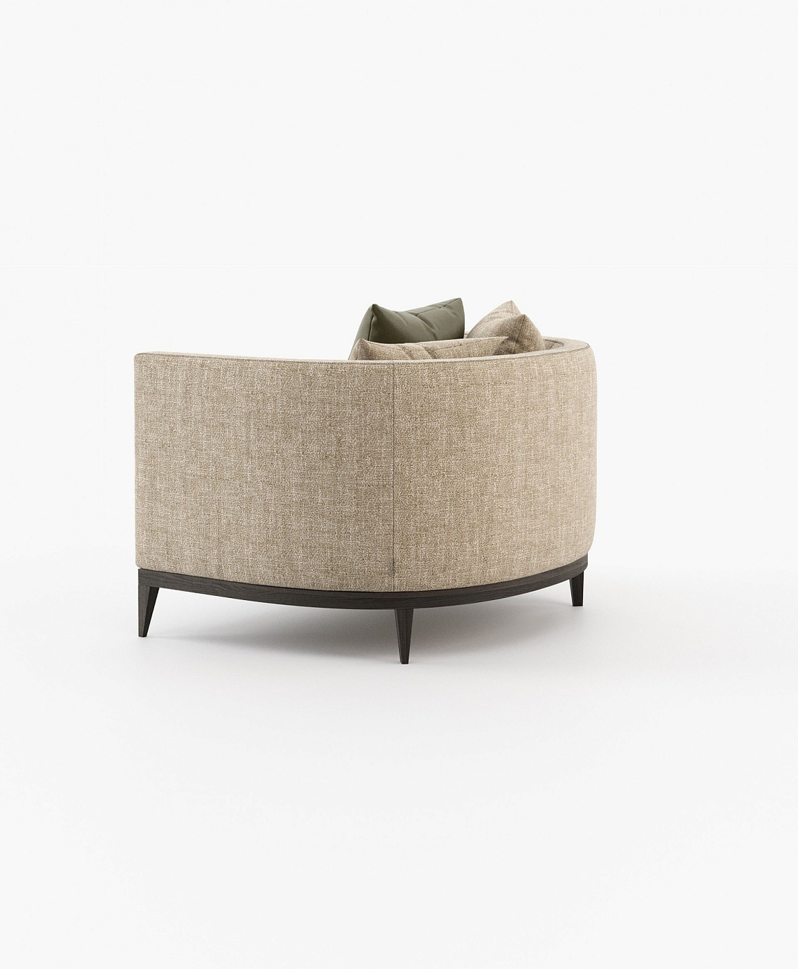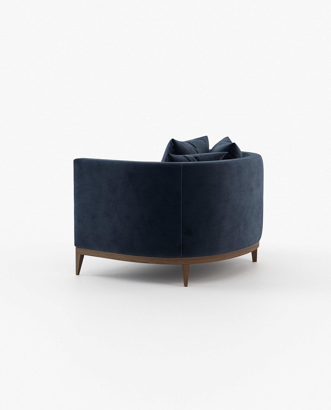 Мягкое кресло с деревянной основой, с подлокотниками и ножками по прямым линиям спереди и закругленной структурой сзади, создающими внушительное и комфортное ощущение.