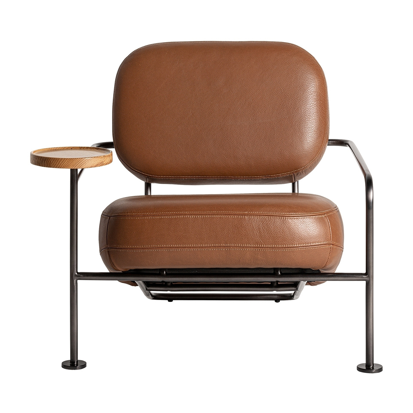 Кресло имеет сборную конструкцию, которая состоит из металлического каркаса и двух подушек в кожаной обивке.