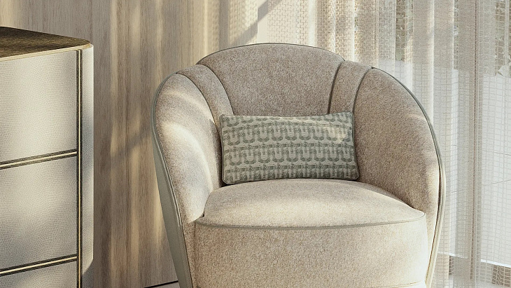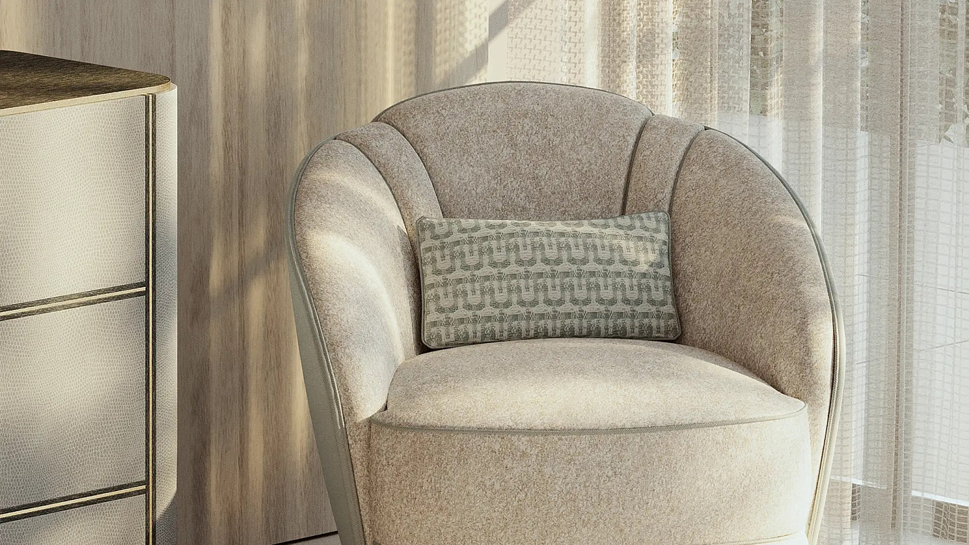 Гламурное коктейльное кресло SAMARA, скроенное по индивидуальному заказу, привносит в интерьер элегантную атмосферу ар-деко. Мастера-обойщики FRATO подчеркнули его пышные пропорции и форму раковины контрастной окантовкой.