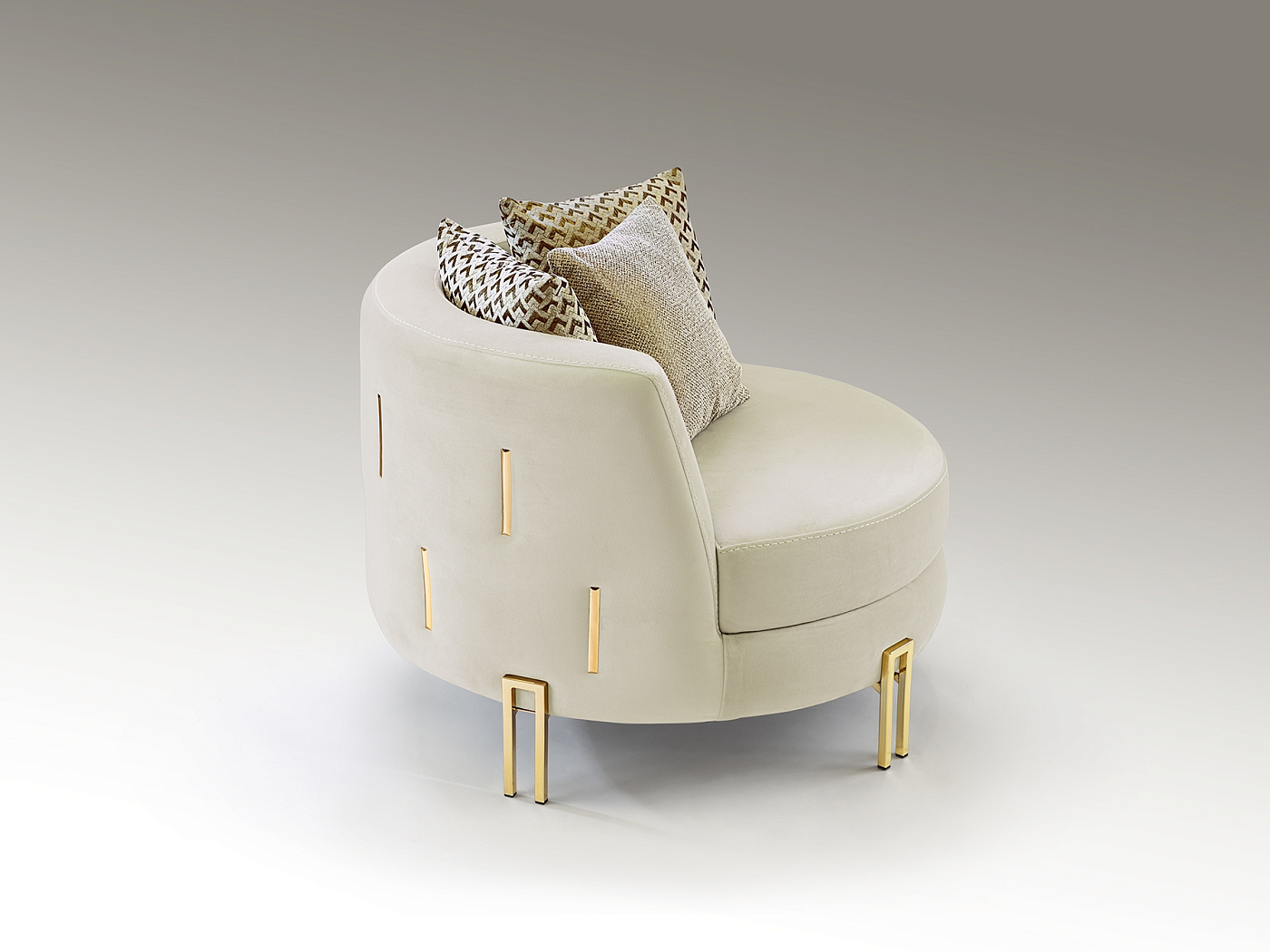 Кресло, обито кремово-белым бархатом, подушки комбинированные. Металлические ножки и декоративные пластины с золотистой отделкой. Ткань 100% полиэстер 320 гр/м². Каркас из бука. Наполнен поролоном 36 кг/м³ и холлофайбером