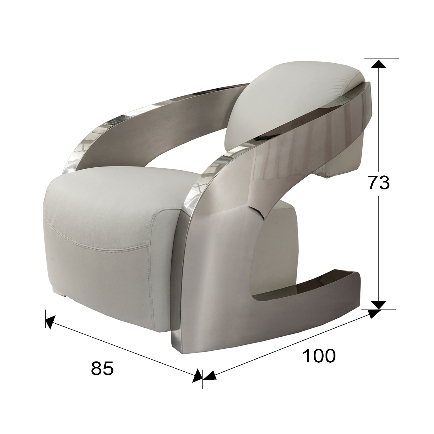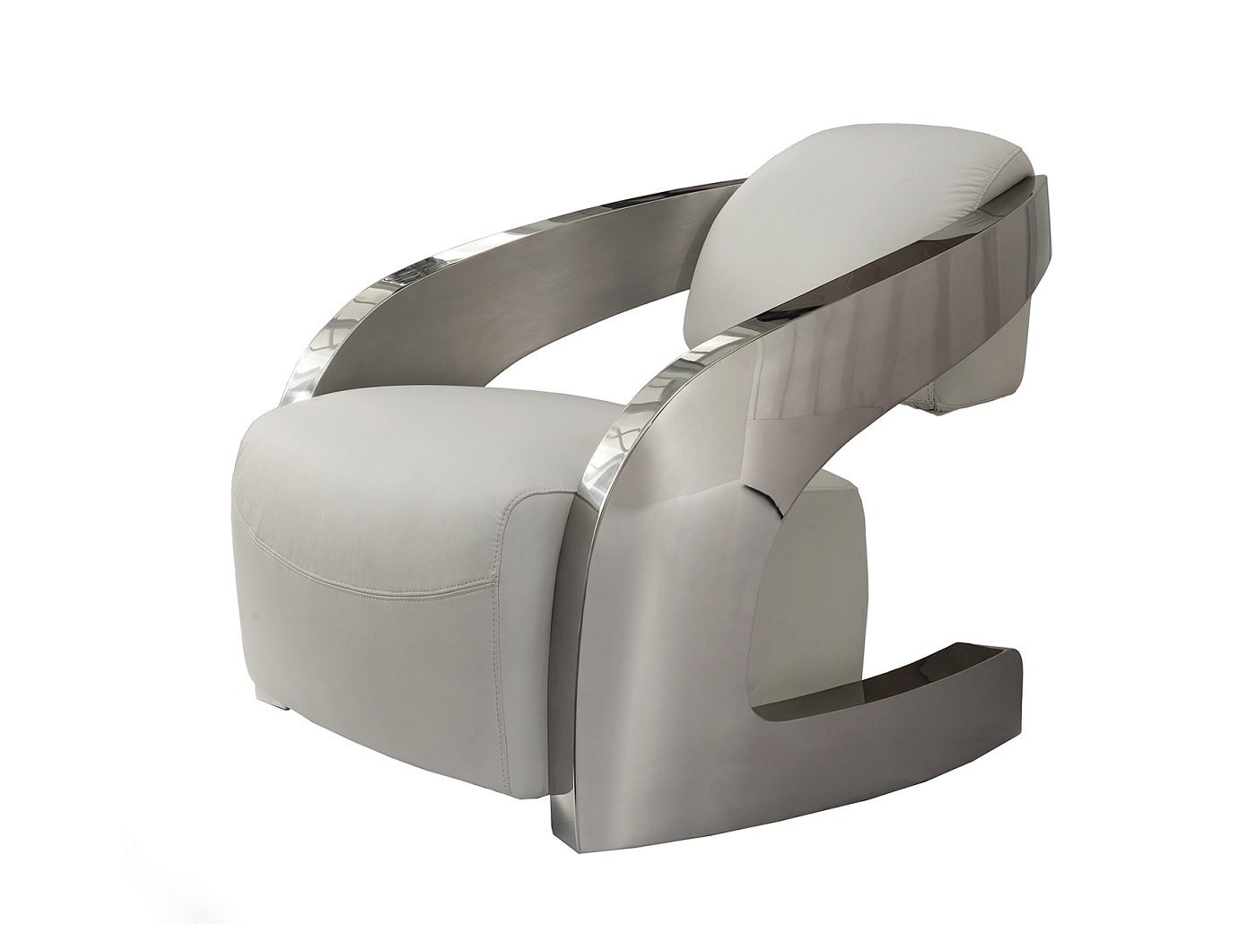 Кресло с обивкой из итальянской кожи белого цвета, отстроченной нитью белого цвета, каркас из полированной нержавеющей стали, проверенное удобство.