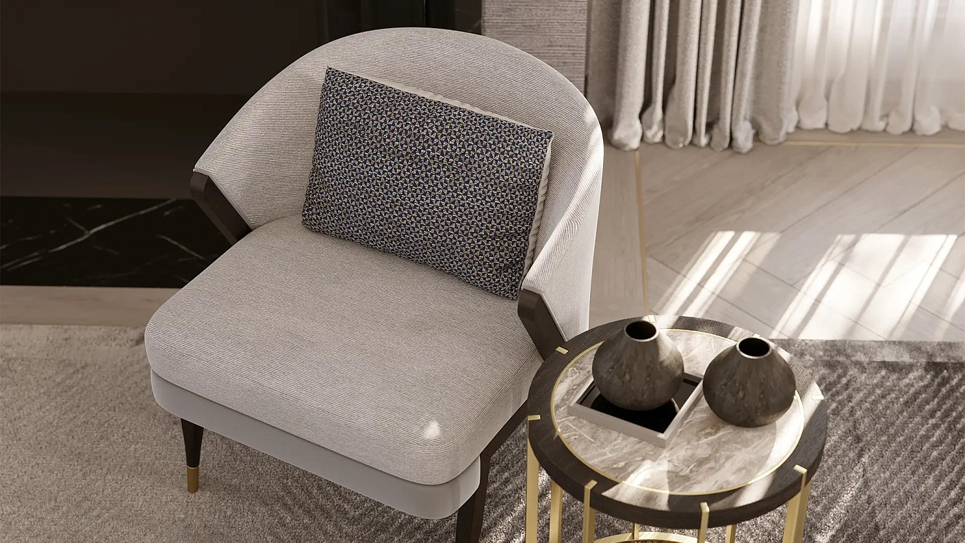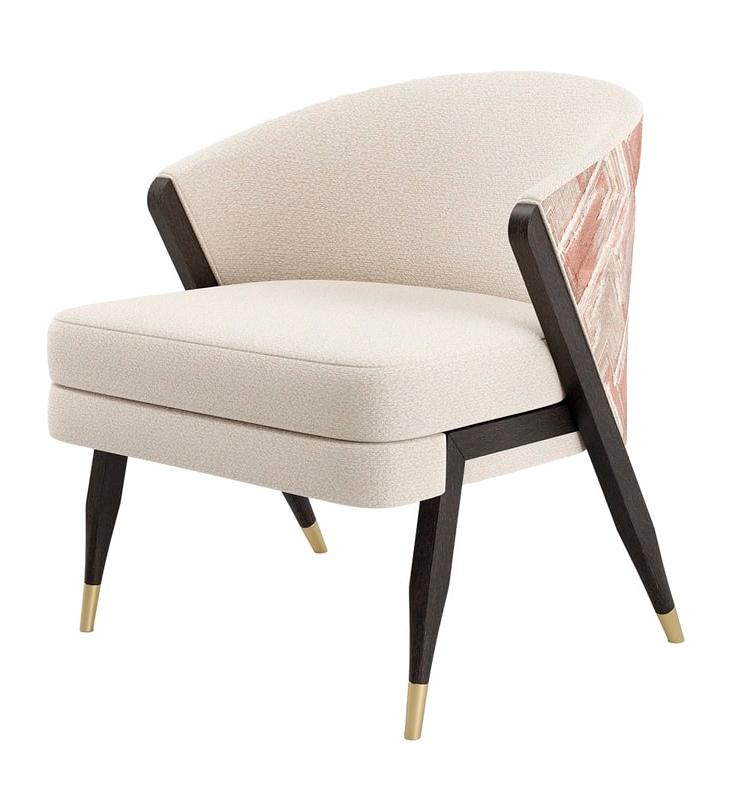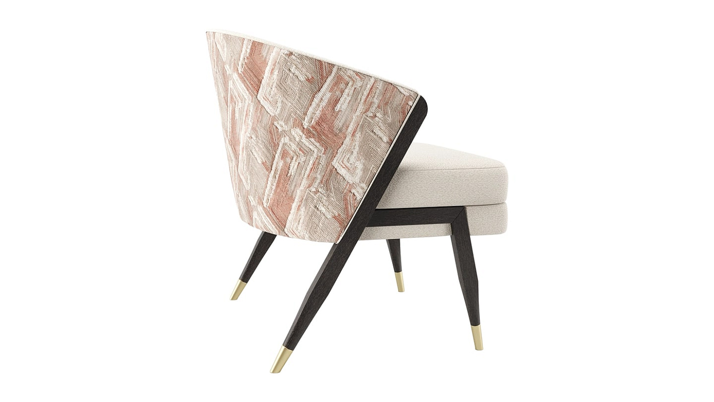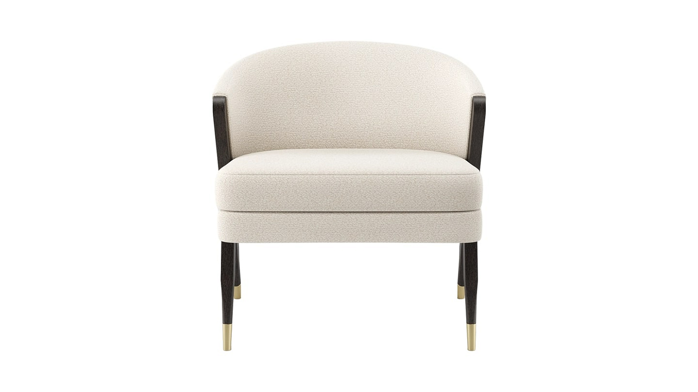 Белоснежная обивка подчеркивает каркас кресла CARMEL, облицованный шпоном темного дерева, подчеркивая то, как подлокотник плавно переходит в линию ножек.